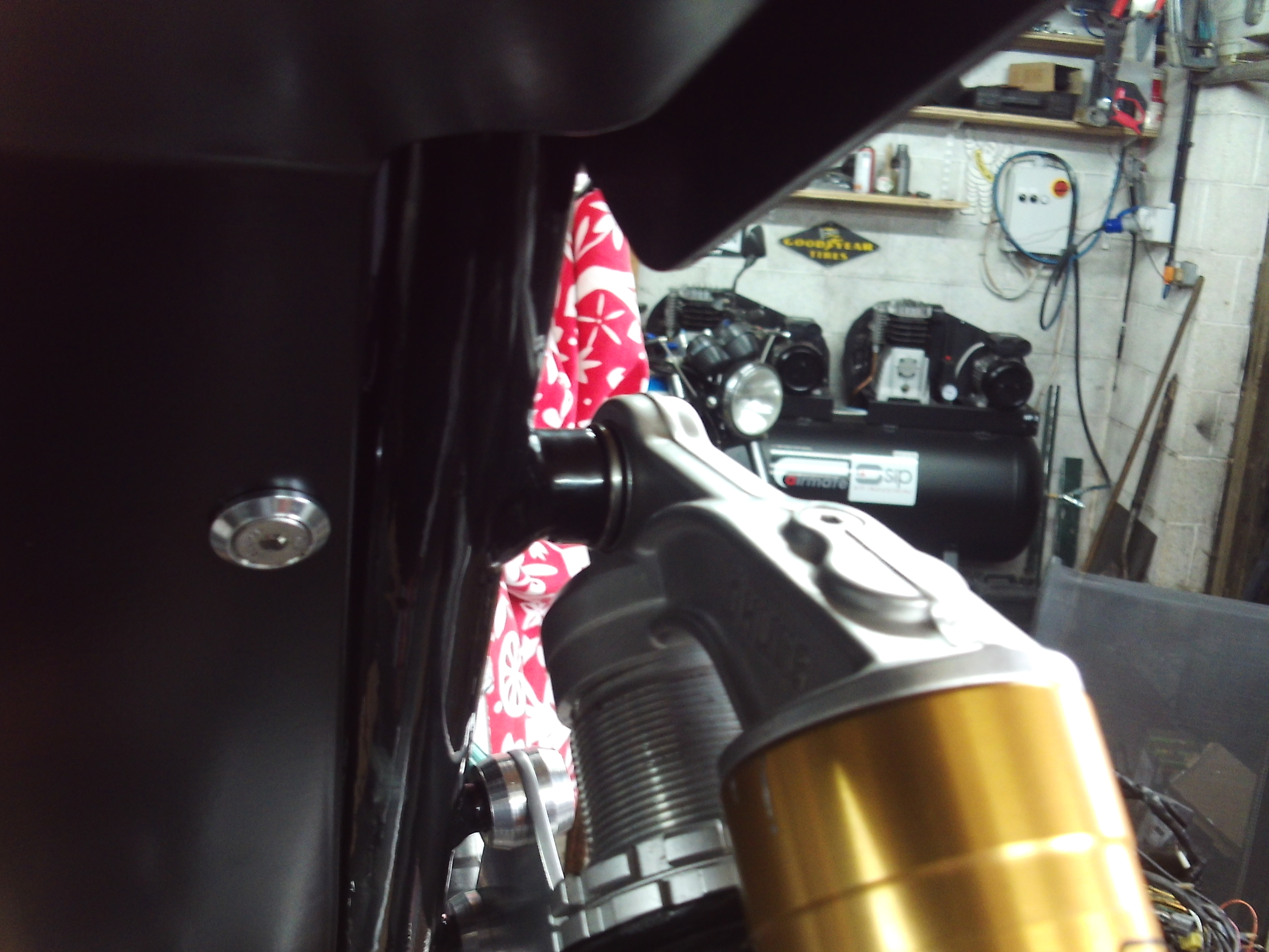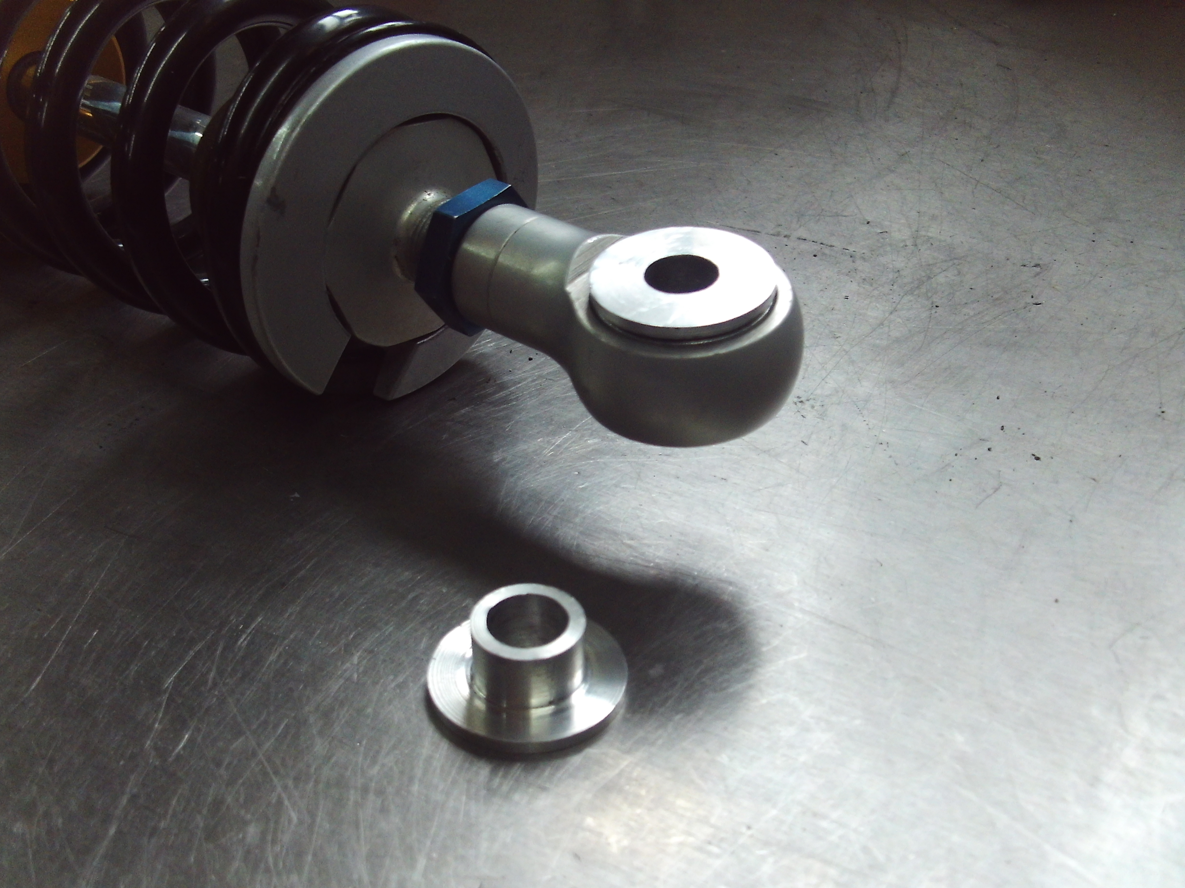 Bottom rear shock eyes needed the bolt hole diameter reducing down to 10mm to match the XJR arm with the aid of some top hat sleeves .