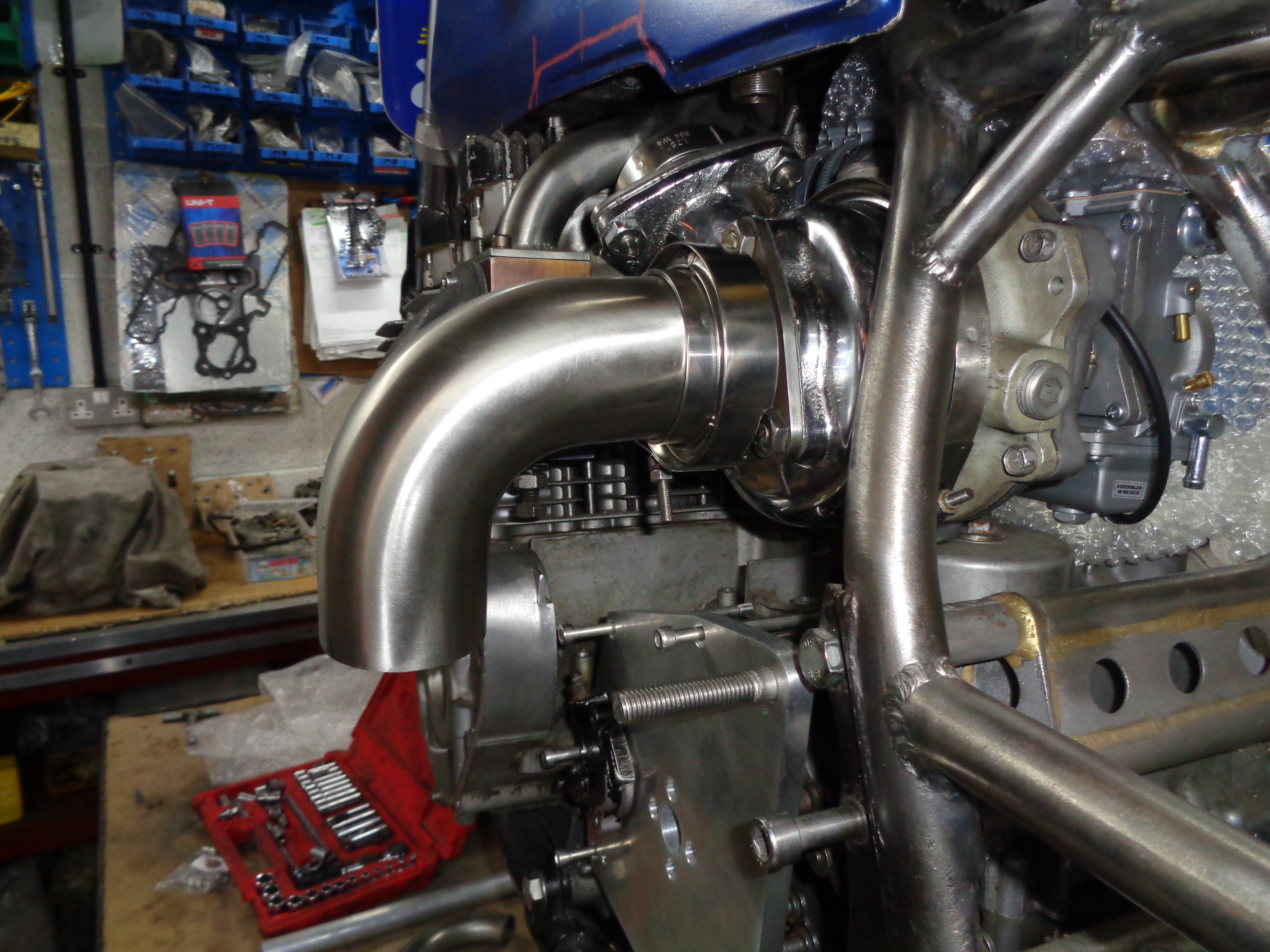 That's as far as i can go with the exhaust for now because the straight run to the lower bend touches the clutch slave so the next job is to sort out the chain alignment with that 6 inch rim and see if i can change the support bearing design and push the outrigger plate inboard a few mill to gain some clearance.