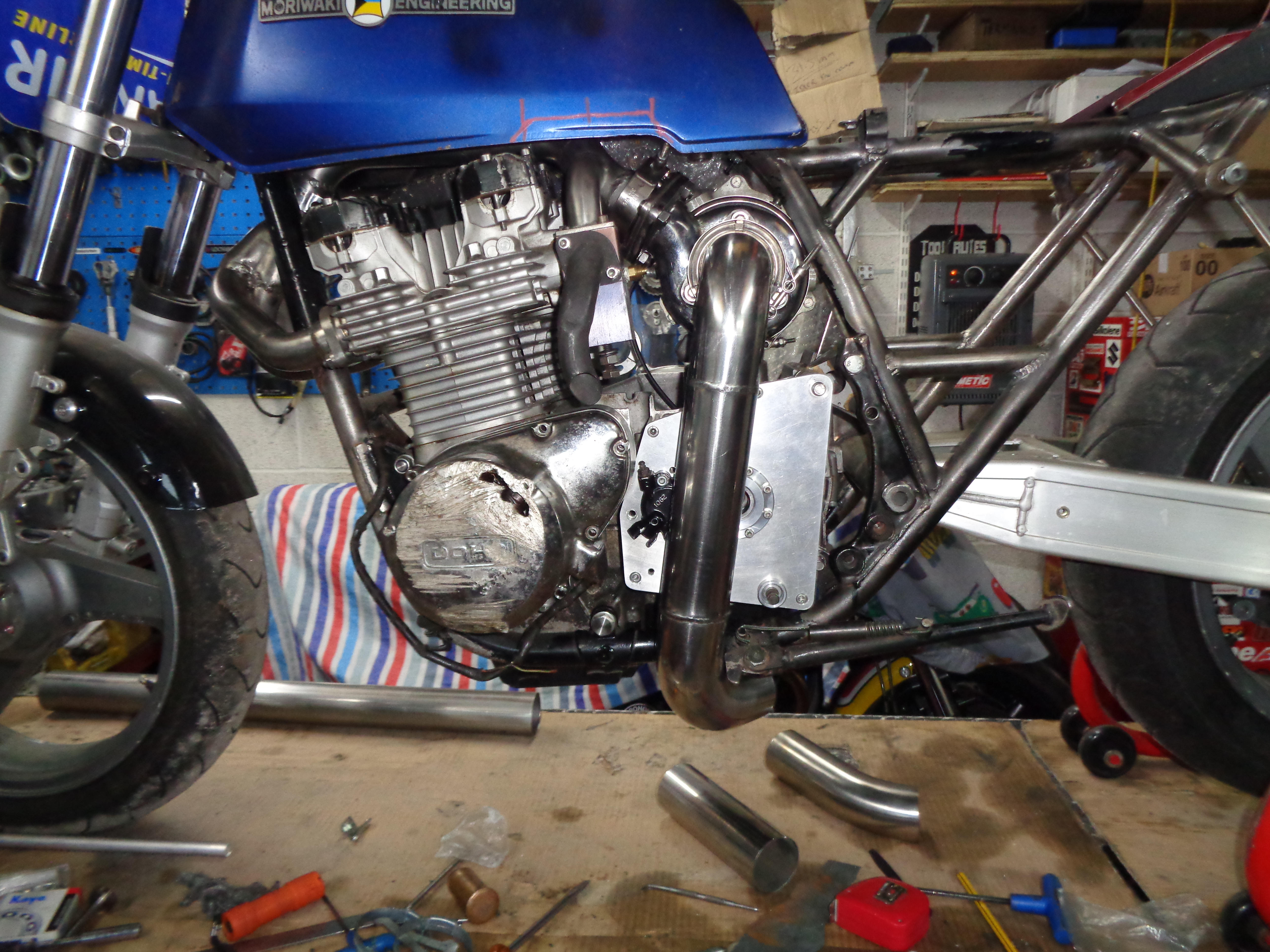Rather than just having a short outlet i want to run the exhaust Egli style down, under and behind the deep sump ending with the Moriwaki can in the usual position on the right so it retains the silhouette of a normally aspirated bike from a distance.