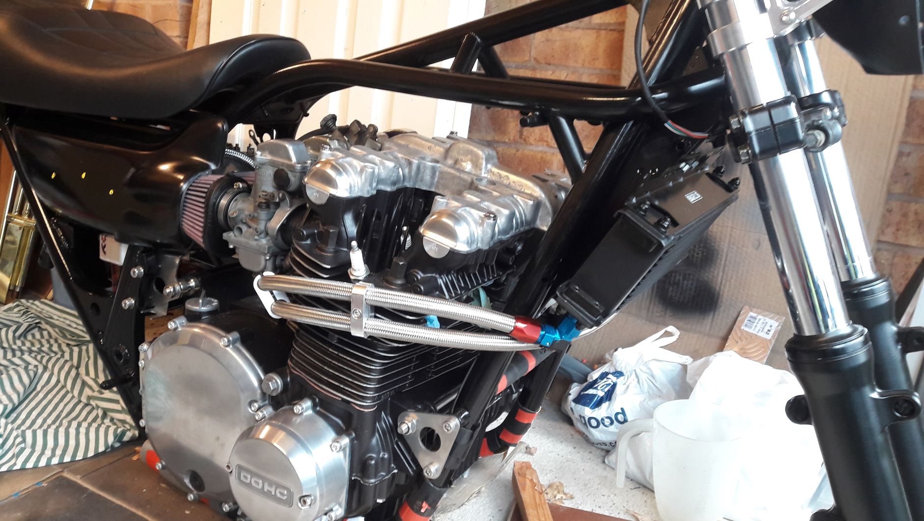 Tasks completed: wiring finished, HT leads & dyna coils fitted, rear suspension fitted, foot pegs on, hydraulics for brakes and clutch 90%, carbs on, throttle cables fitted, instruments and warning lights done.