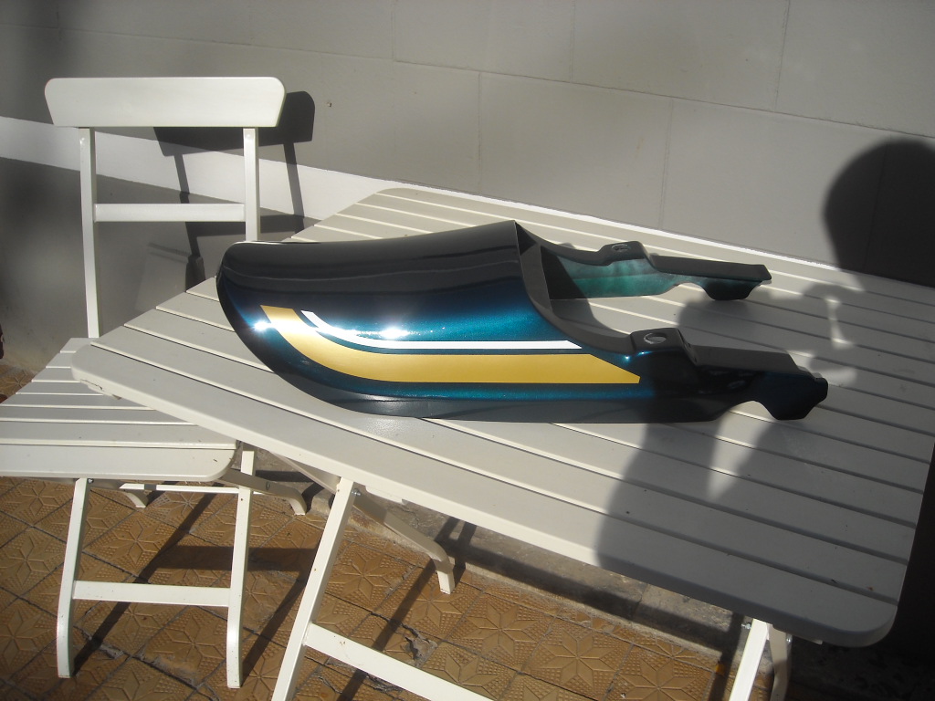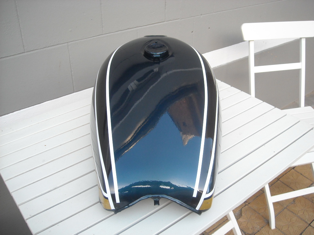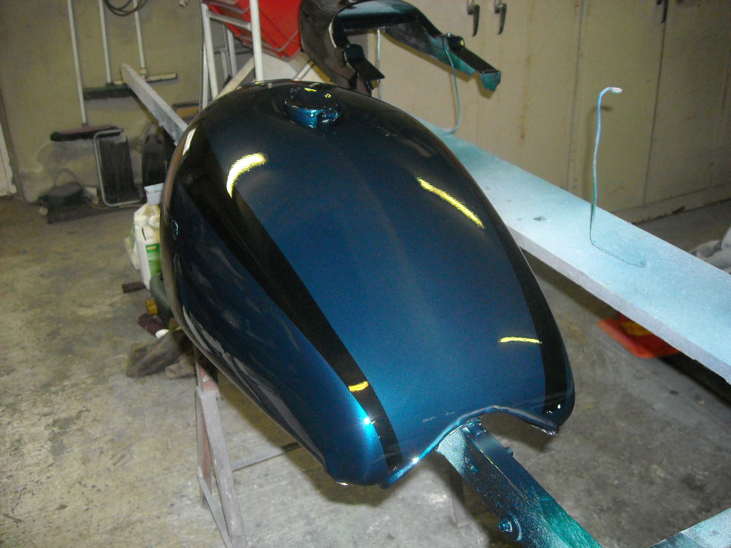 This was the result after the first attempt, the fuel tank with the black paint recieved a coat of clear coat. After it dried, the black stripe was mesured, a little sanding with wet ot dry n° 1000, taped off and the blue paint was sprayed.