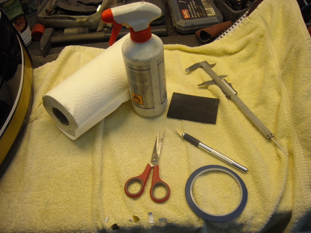 a pair of scisors, a measuring instrument, fine adhesive tape, a piece of rubber, paper towels, a spray bottle with water and a drop of dishwashing soap, a hobby knife with a rasorsharp blade and a lot of luck!