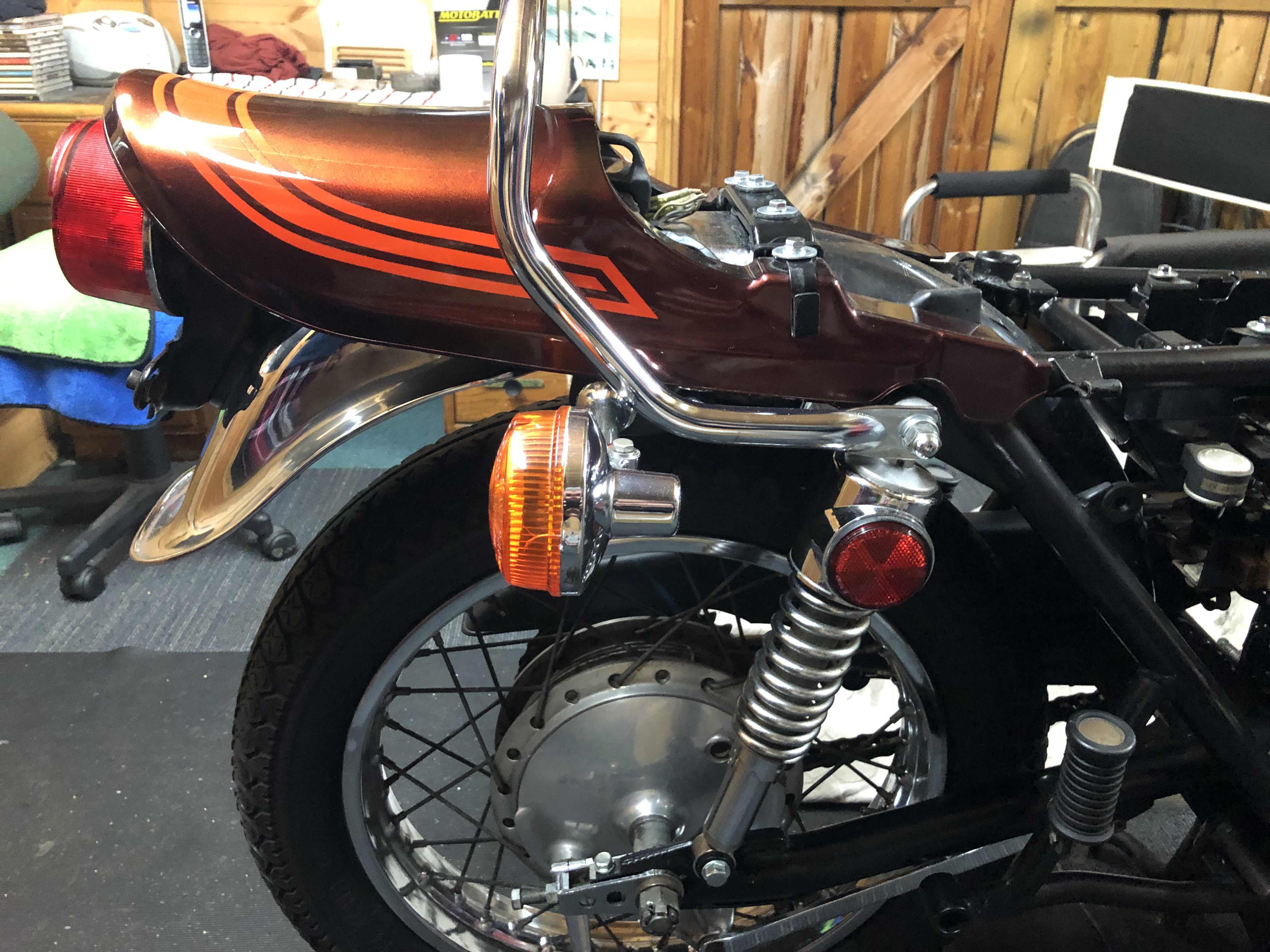 Original shocks fitted, rear grabrail fitted, a bit more work on the electrics completed and have managed to progress the paint on the engine.