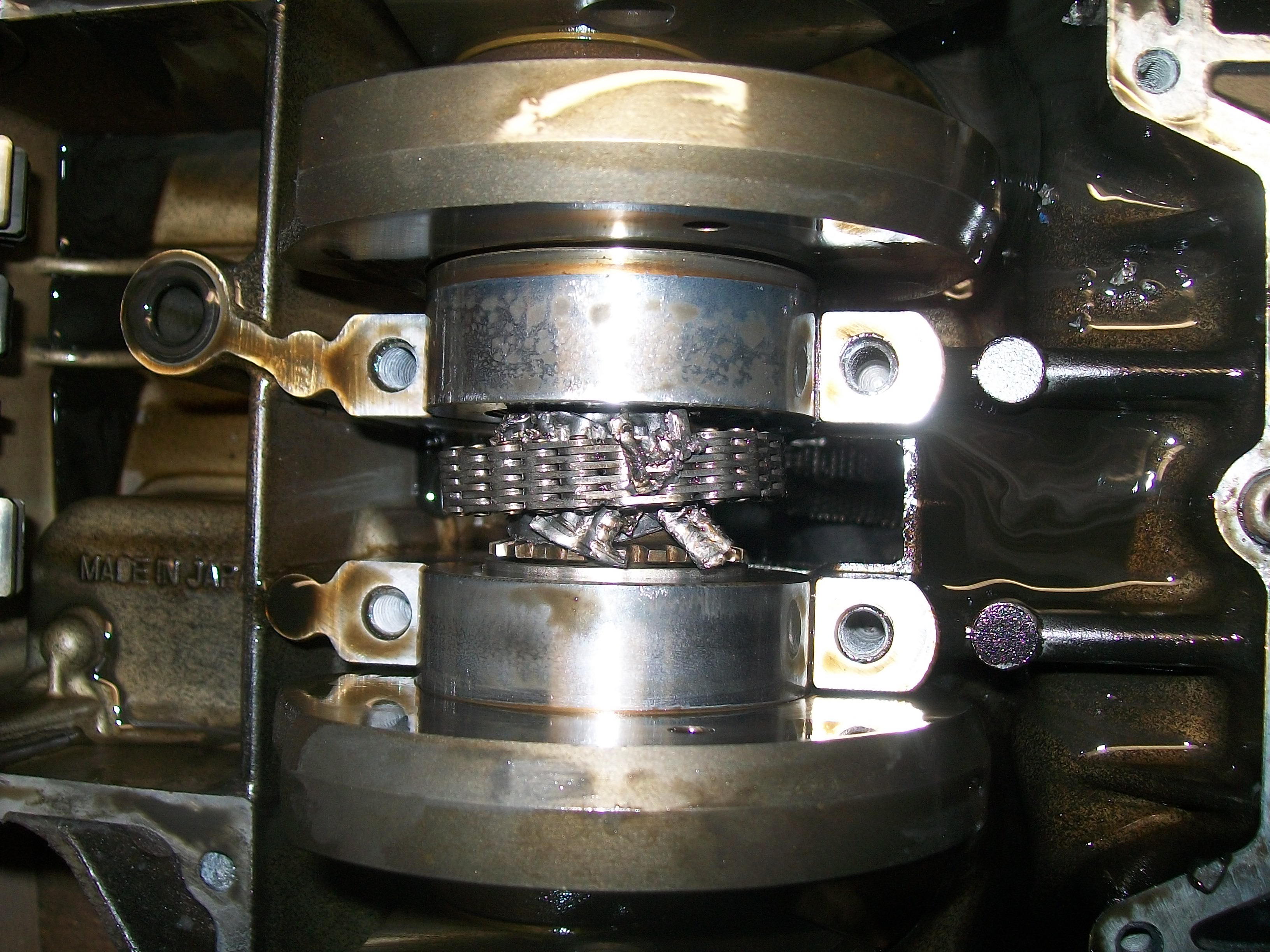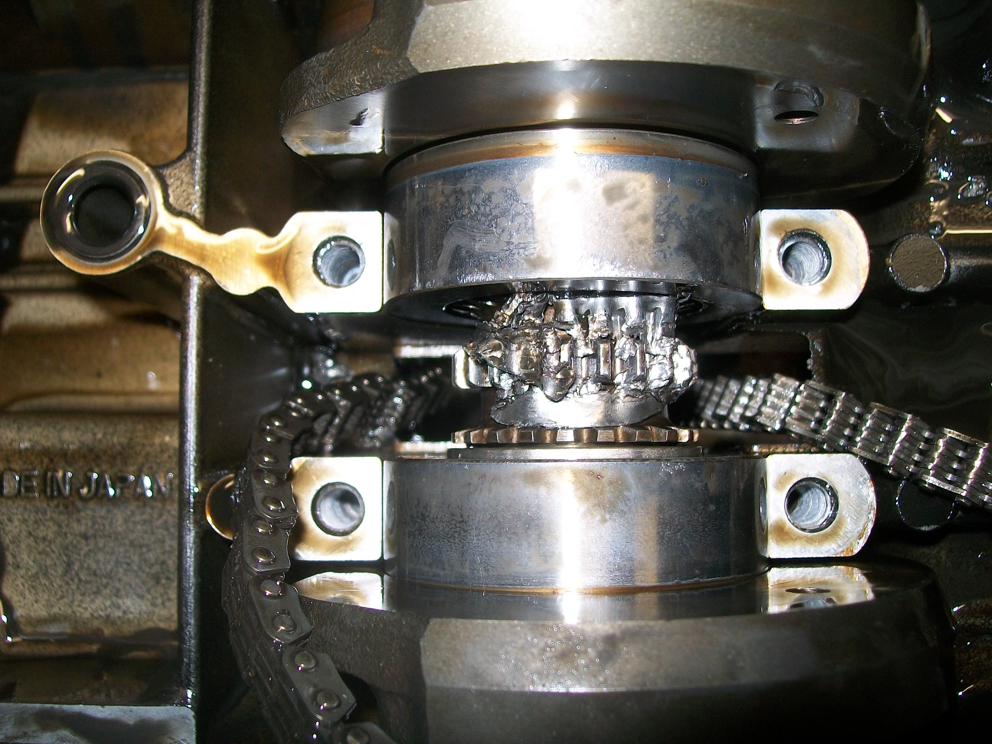 I think that the metal parts around the crankshaft sprocket are the remnants of a camshaft guide that fell into the camchain tunnel when a camshaft was taken out.