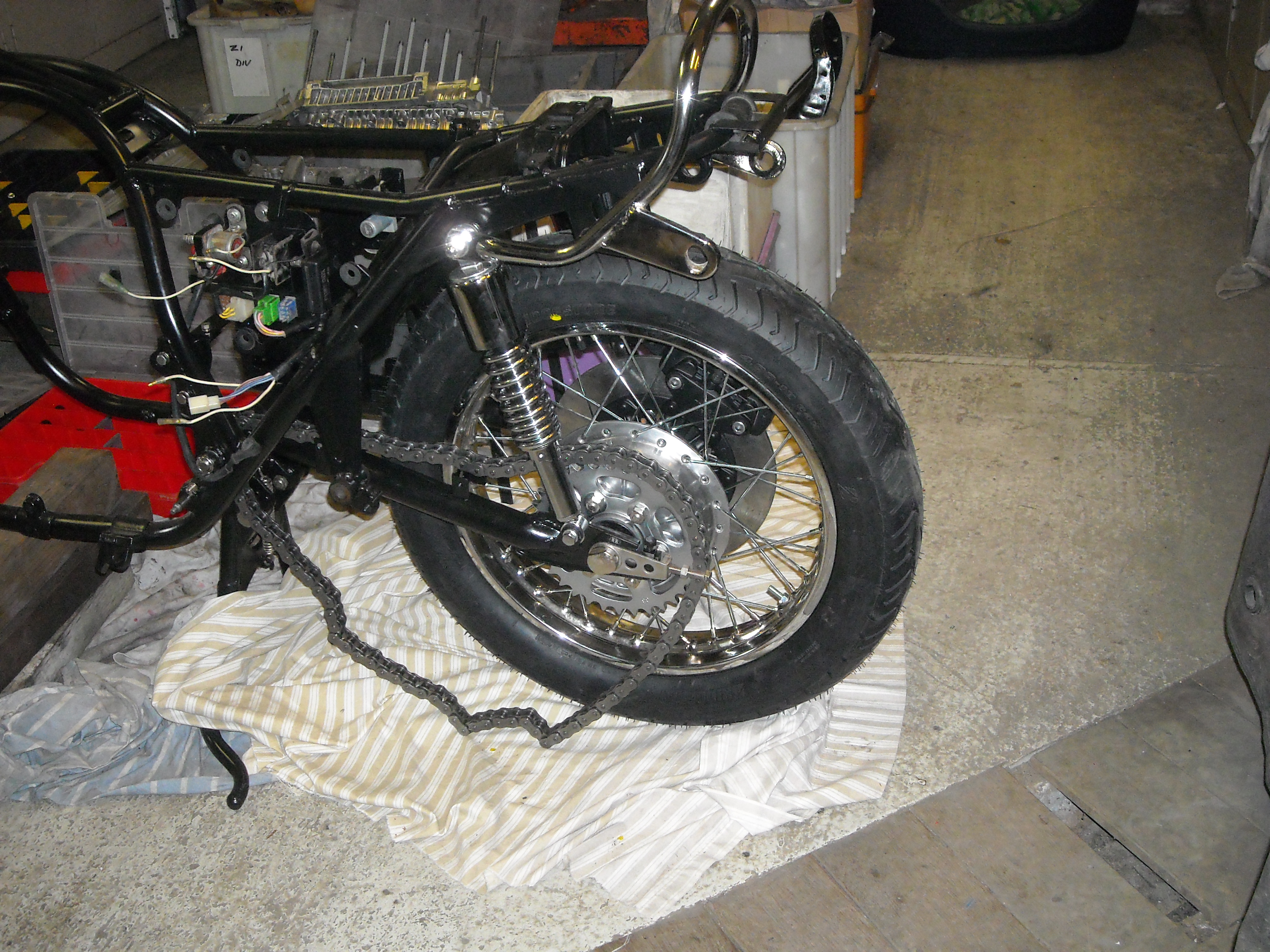 The rear wheel was installed in the swing arm and this is what it looks now.