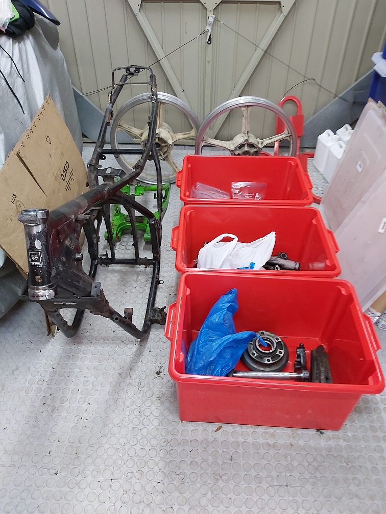After another weekend in the garage, I've finally finished cleaning and checking the frame and running gear. Thankfully, I didn't find any horrors and with everything sorted into various containers, it's time for a trip to the Powdercoaters :-)