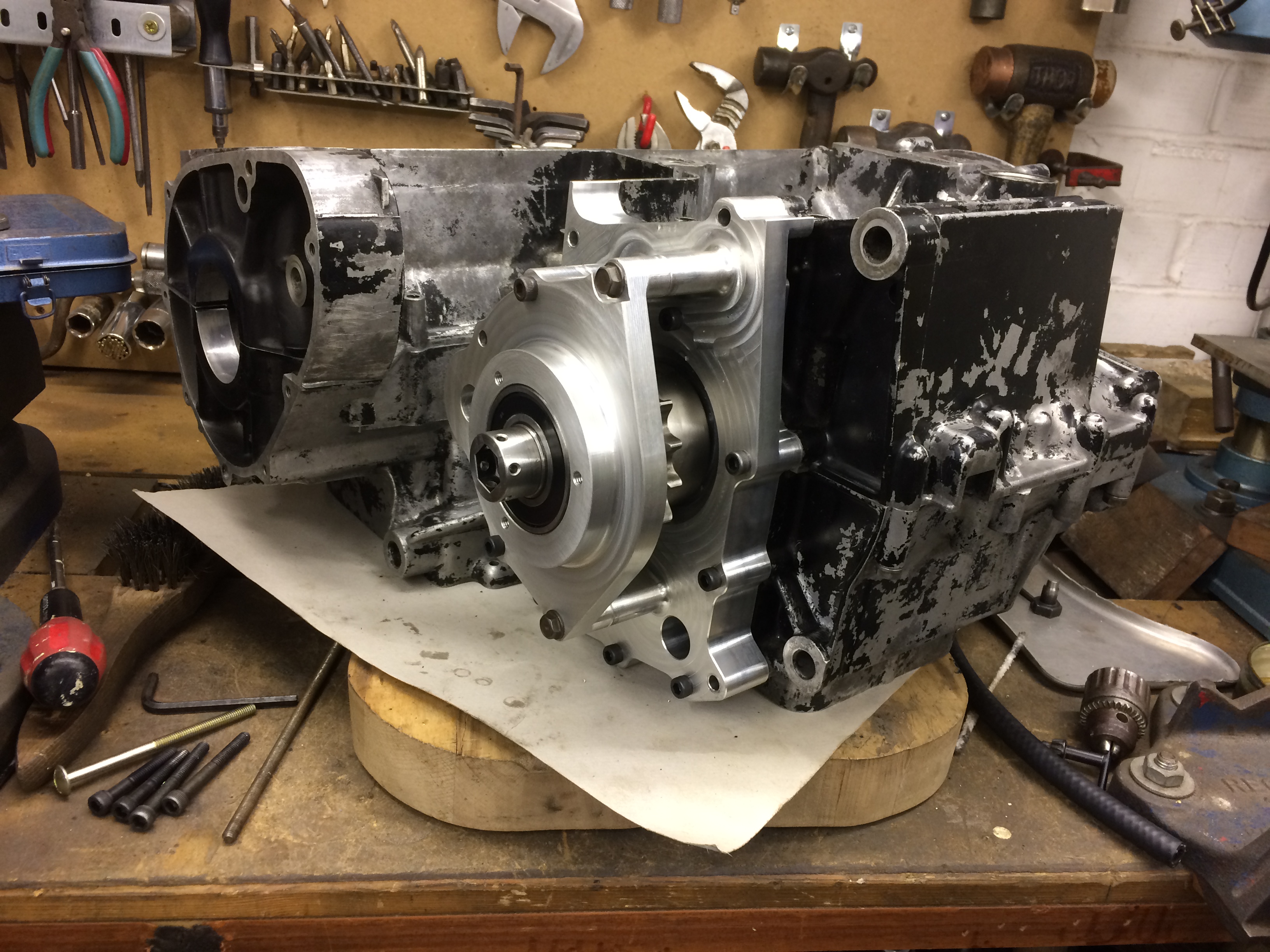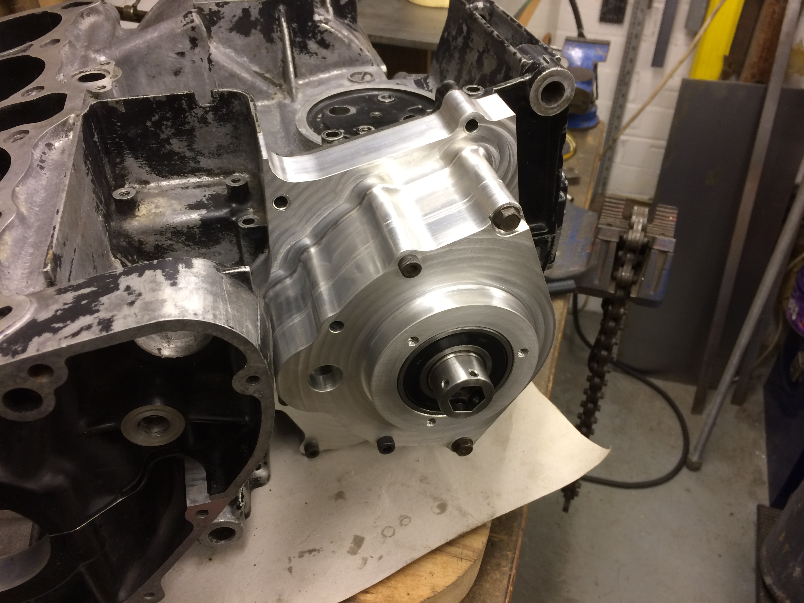 These are quite detailed parts and I’d used up most of my favours by now, plus I couldn’t ask anyone to risk getting dropped in the shit with the gaffers through making parts for me, so I sent the drawings to a few engineering companies to get quotes. One quote was massive, another was £710 but the best was £380 from TS CNC Ltd in Willenhall. I got two slabs of 6082 aluminium plate from Steel Express in Wolverhampton for £100. I already had the bearing. With the £36 for the piece of EN24 steel for the sprocket the mod had come to just over £500 so far. Needless to say TS got the job and they turned out really good.