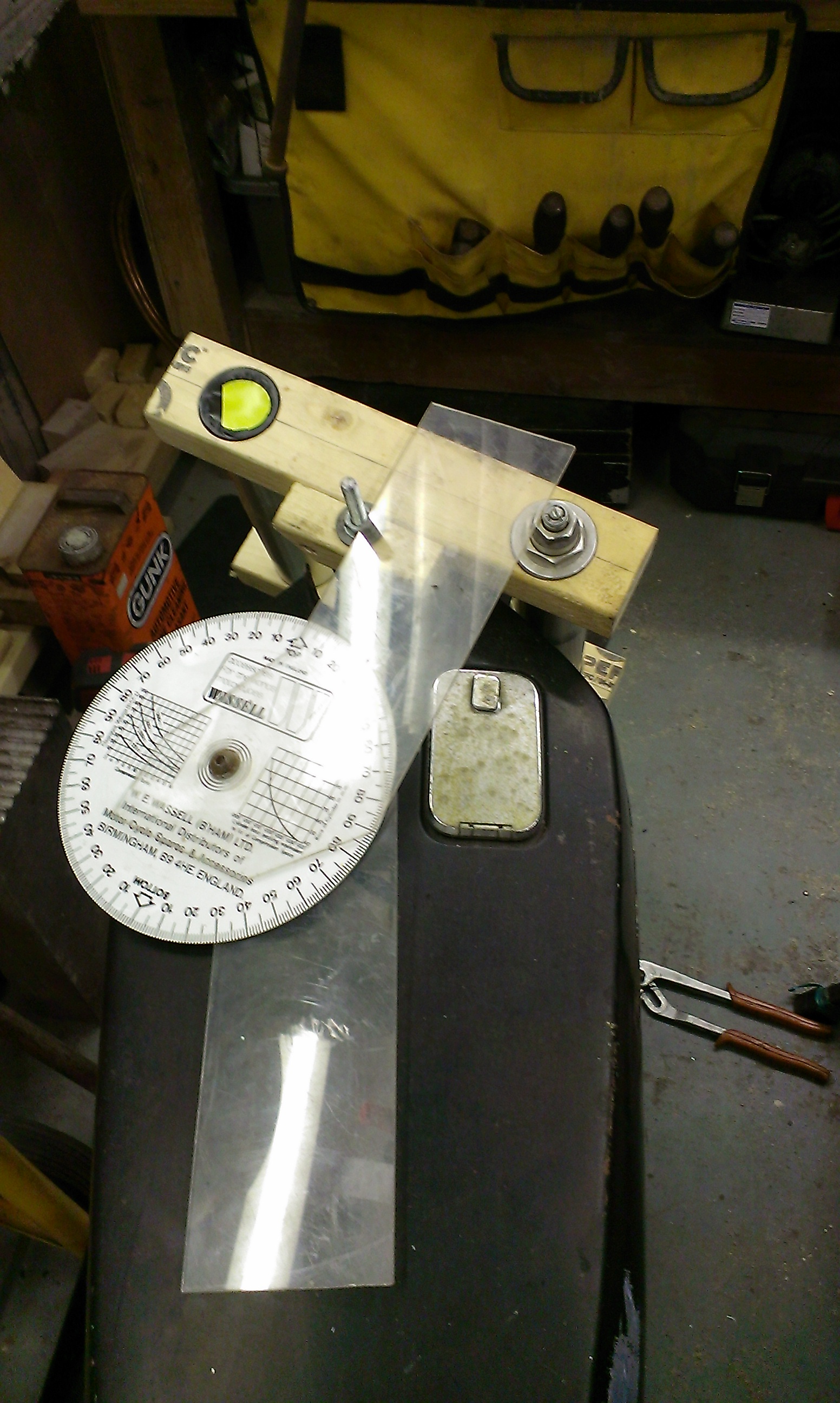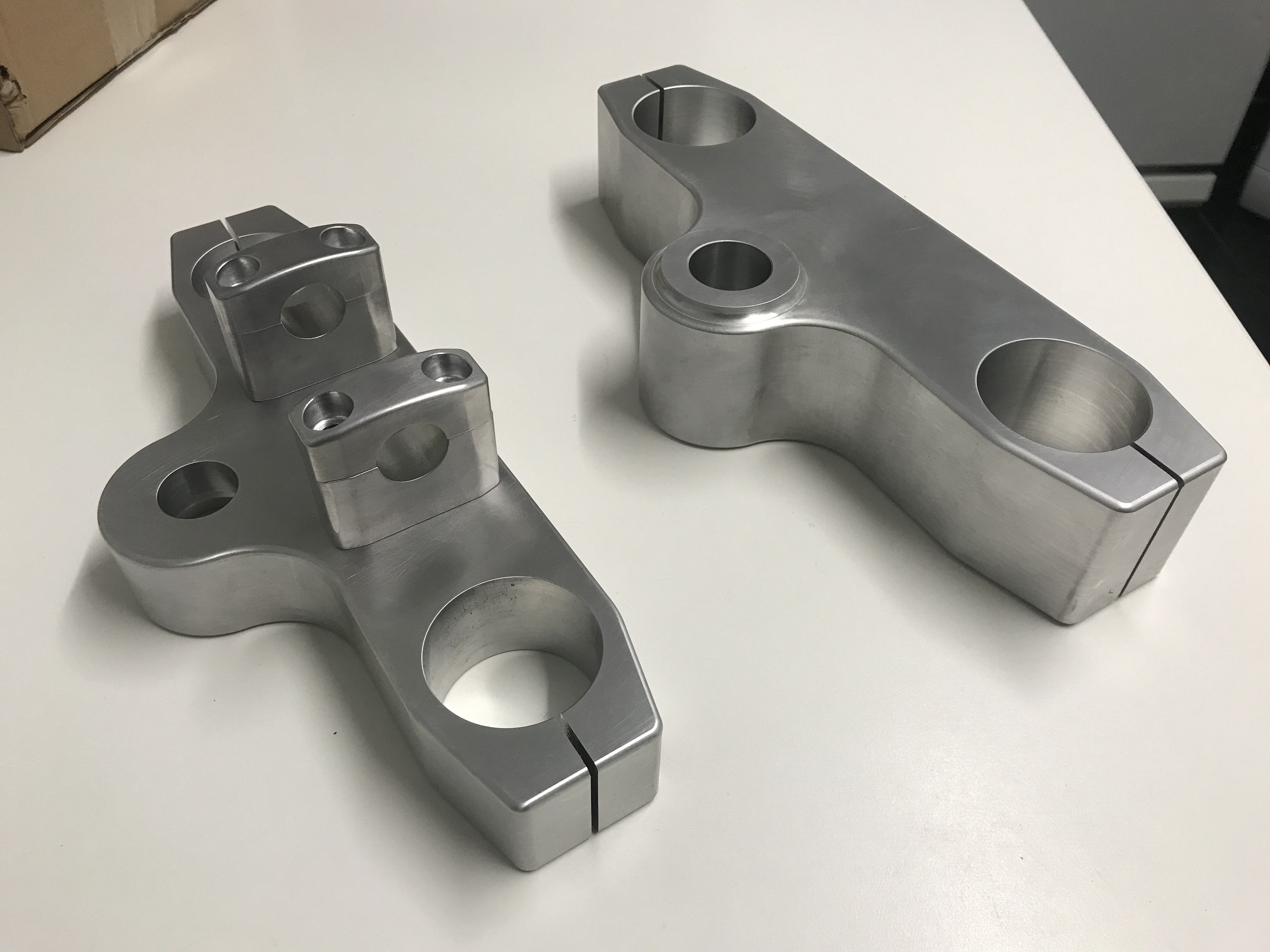 So I’d already got an SRAD front end and needed to make yokes compatible to the Zed frame. The first thing I noticed about the USD forks is their lack of length, plus the SRAD front wheel is smaller. I’ve had scary tank slappers and a nasty Asda trolley and I know that if things ain’t quite right down there it’ll lead to heap load of trouble. I did some research into rake and trail to get an idea of typical figures just to be sure I wasn’t building something that was gonna spit me off at 120. By using the standard SRAD front end including the 32mm standard yolk offset it would’ve ended up with about a 23° rake and 67mm of trail, but I was looking for more like 26° and about 90mm of trail. The conclusion was to extend the forks. Perhaps not the most ideal thing to do, but it solved the problem. The other thing that became apparent to me when considering different yoke offsets was the steering angle at full lock. The closer the forks are to the yoke spindle (smaller offset), the smaller the full lock steering angle, but greater the trail. Inversely, the greater the offset (the further the forks out in front of the yoke spindle), the greater the steering angle, but the trail becomes less. I didn’t want a bike that needed a 38 point turn in a cul-de-sac, nor did I want a really twitchy front end. I felt a compromise coming on, but where and how was I going to find the happy medium? “I know, I’ll make some temporary yokes”, I thought “and see how they function”.