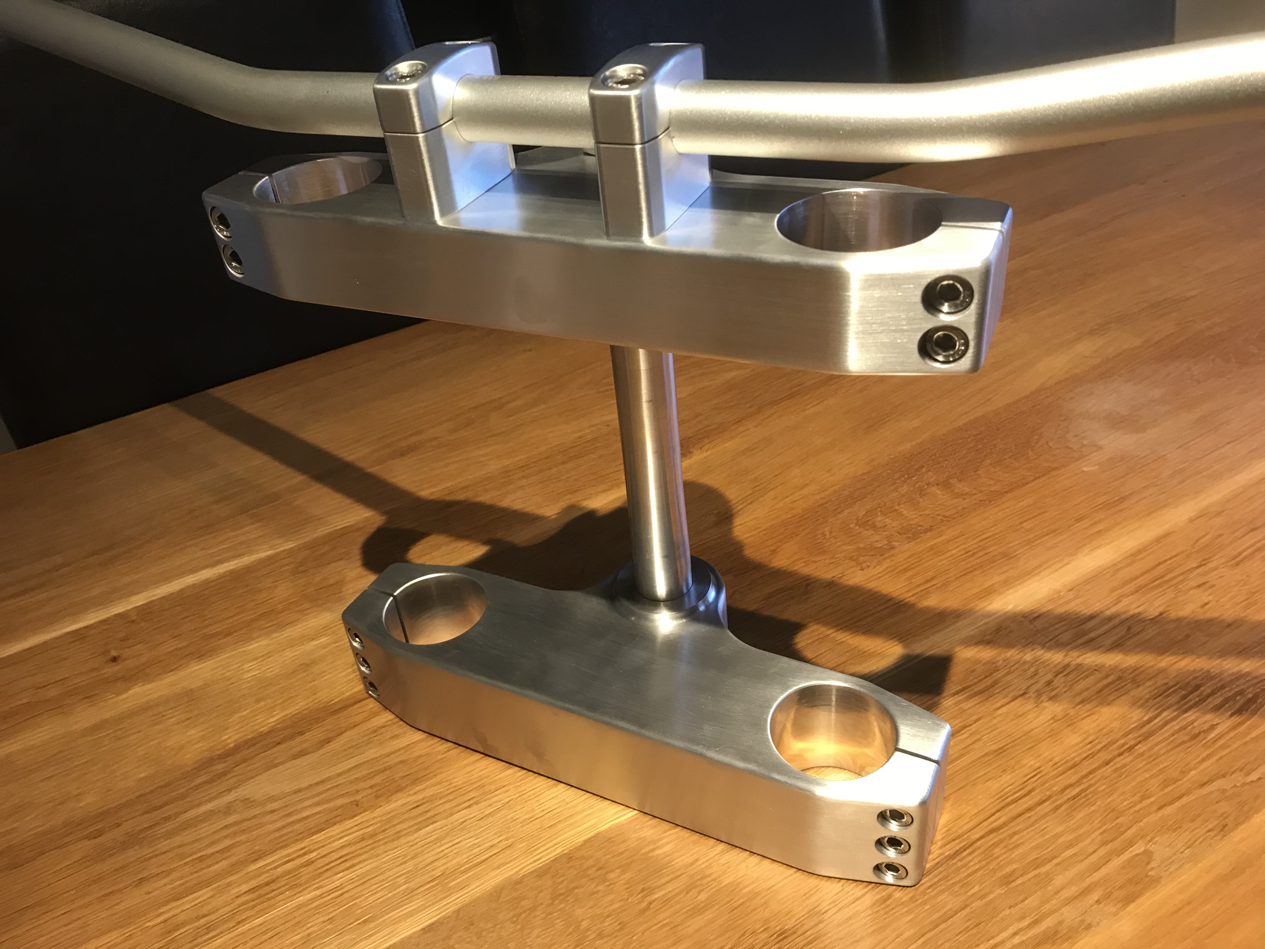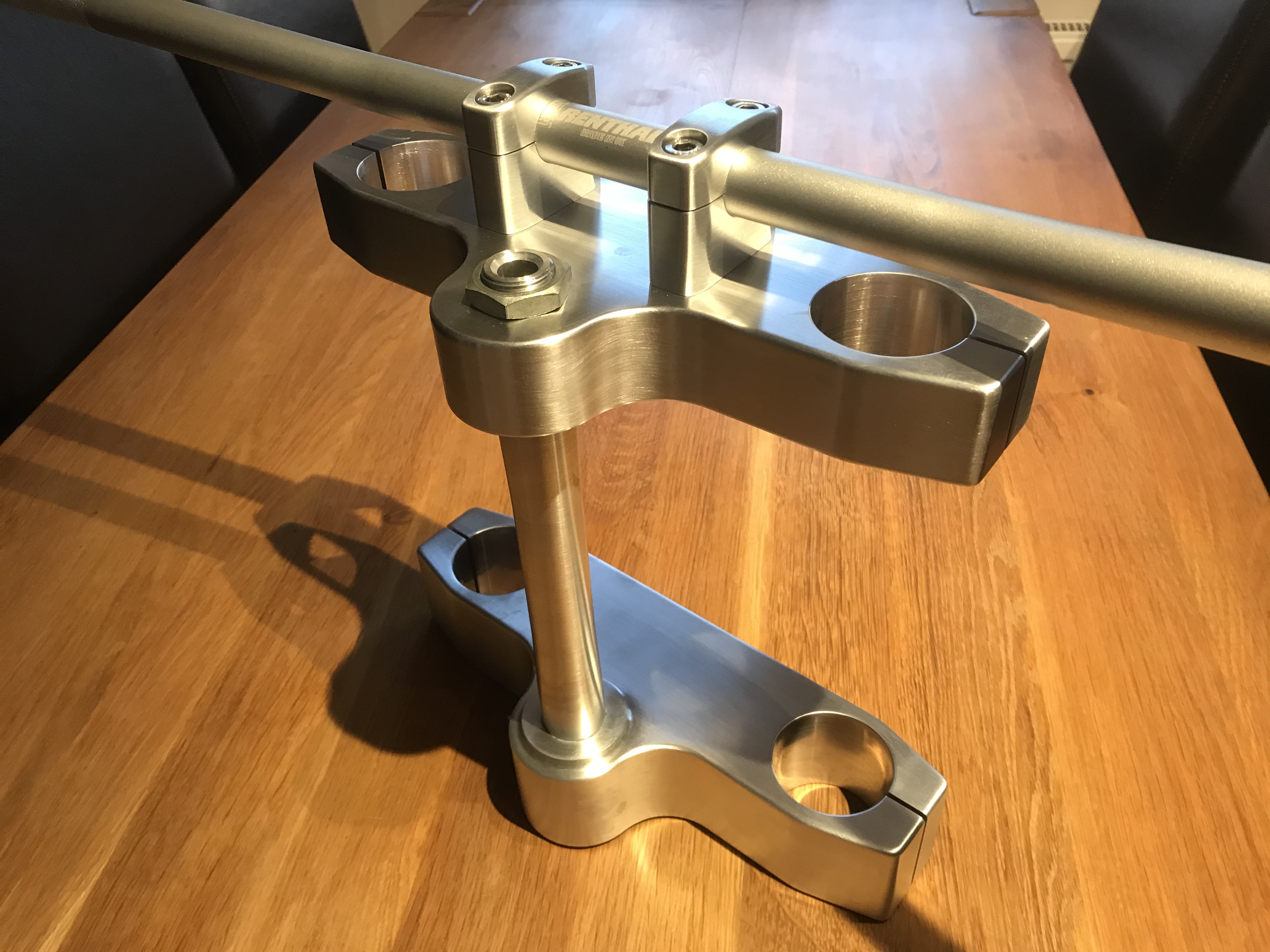 As you can see there, I’ve got some tidy slab yokes going on. I based the spindle on the SRAD one and got the bearing set from All Balls Racing to match the Z frame. A place called Rapid CNC in Brownhills turned the spindle and fork extenders for me and TS CNC machined the yokes and handle bar clamps.