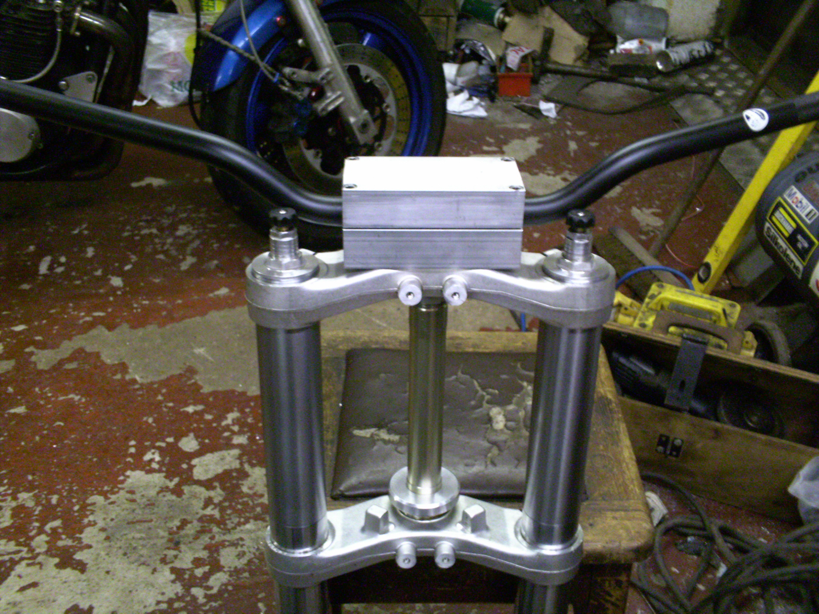 So used another FJR bottom yoke, removed the stem,machined off the lockstops and drilled some holes to take some one off bar clamps