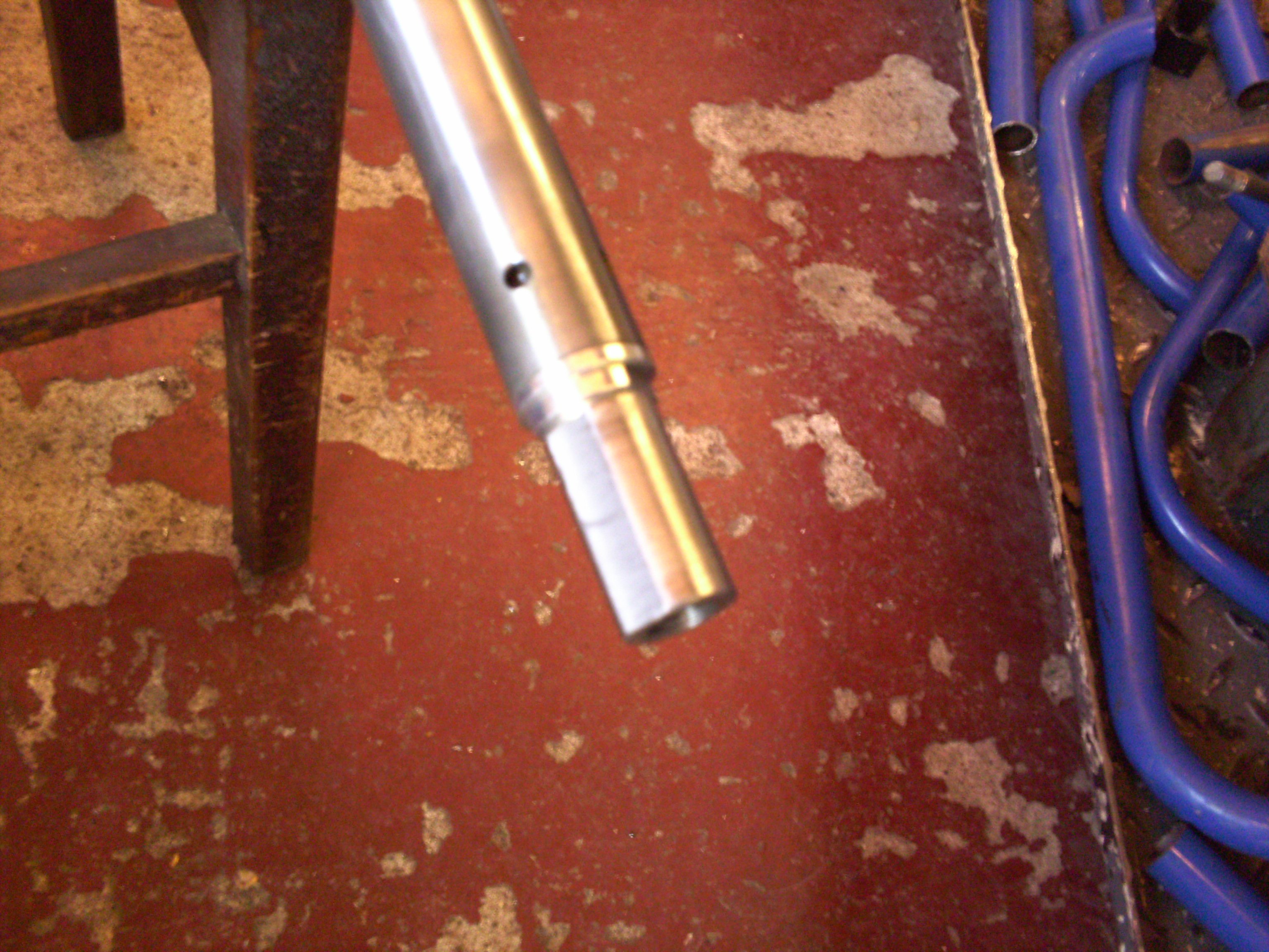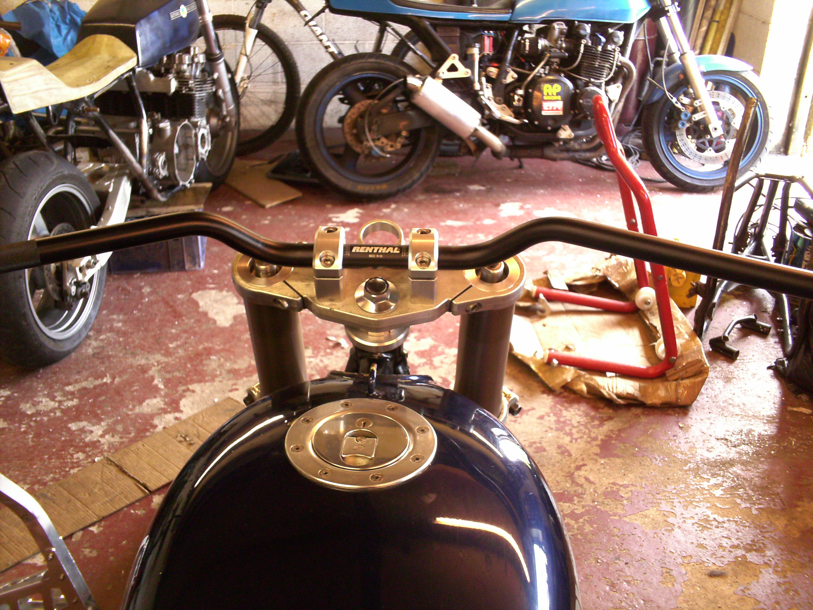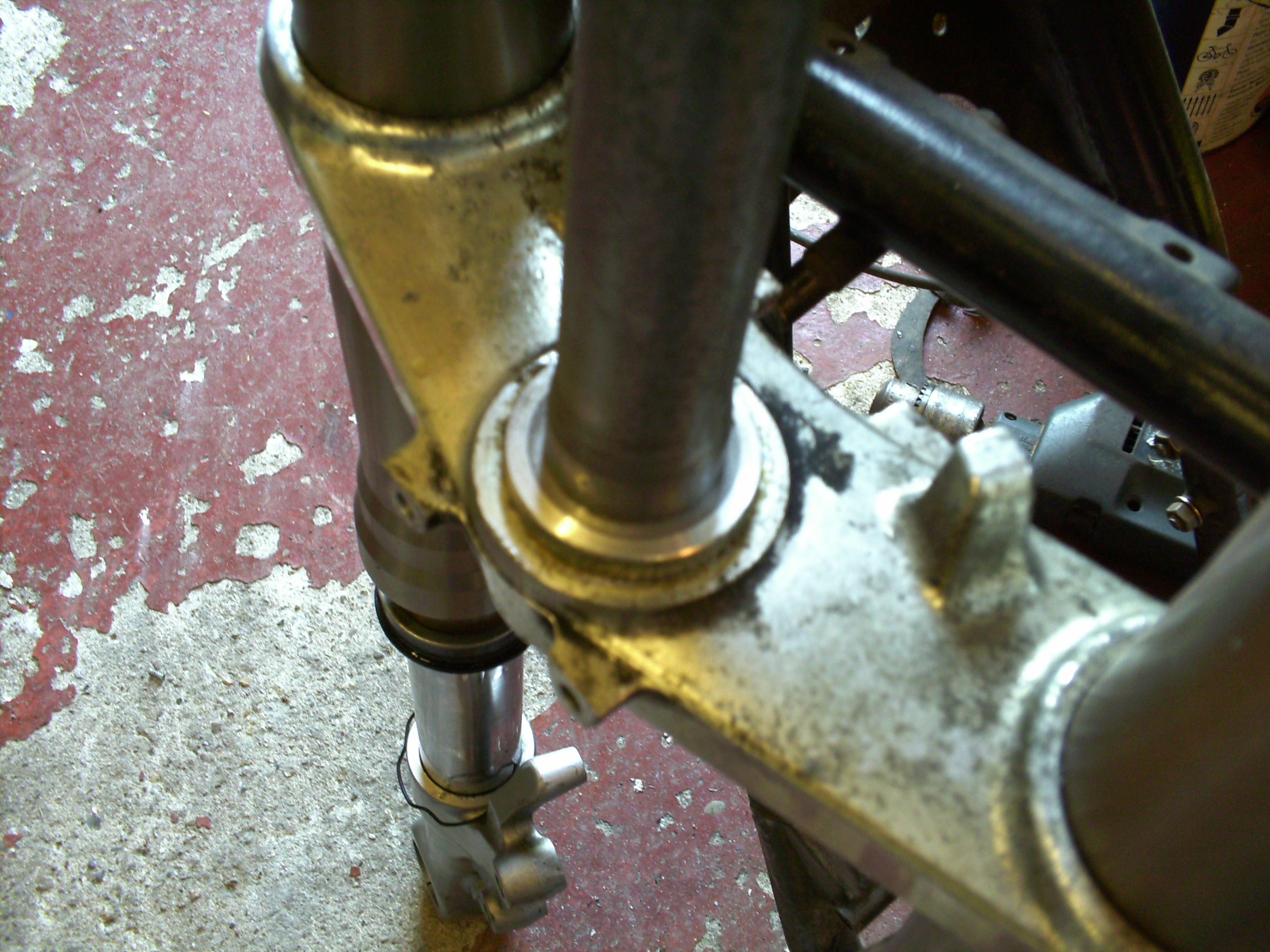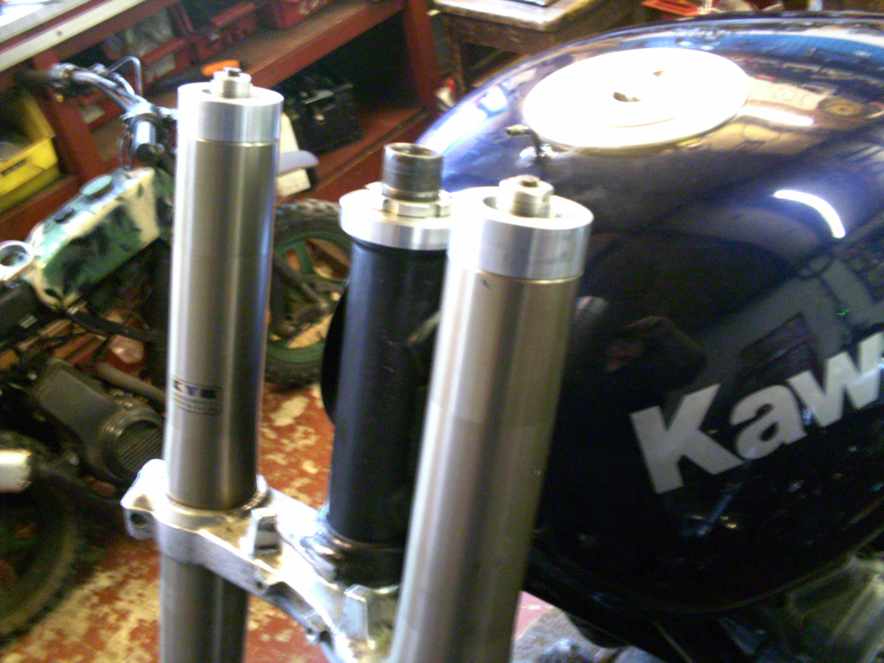 As can be seen in the pics the short ZX7 forks had previously had some 55mm extensions welded on to the fork tops to get some reasonable ground clearance when fitted to a Z frame.