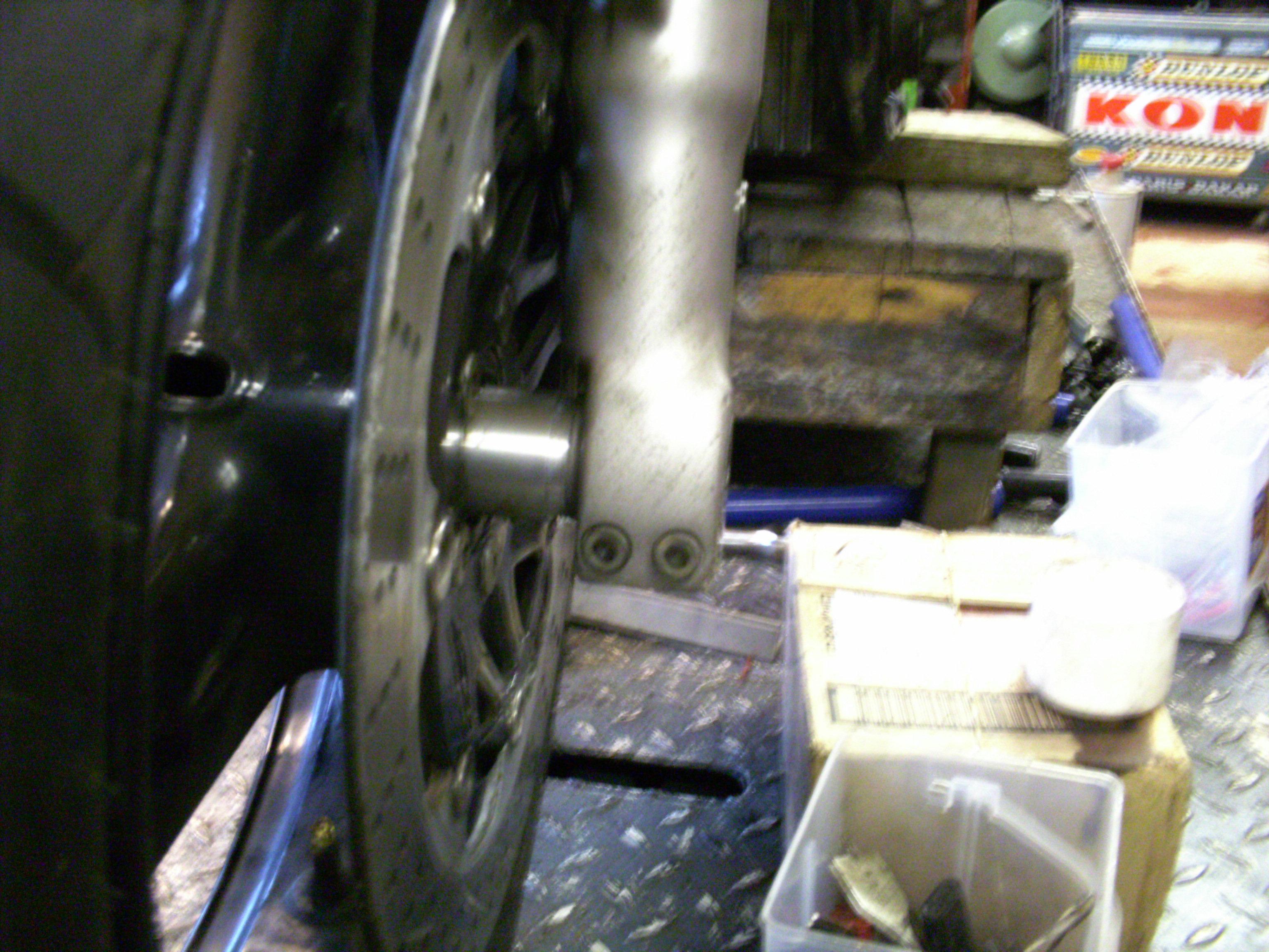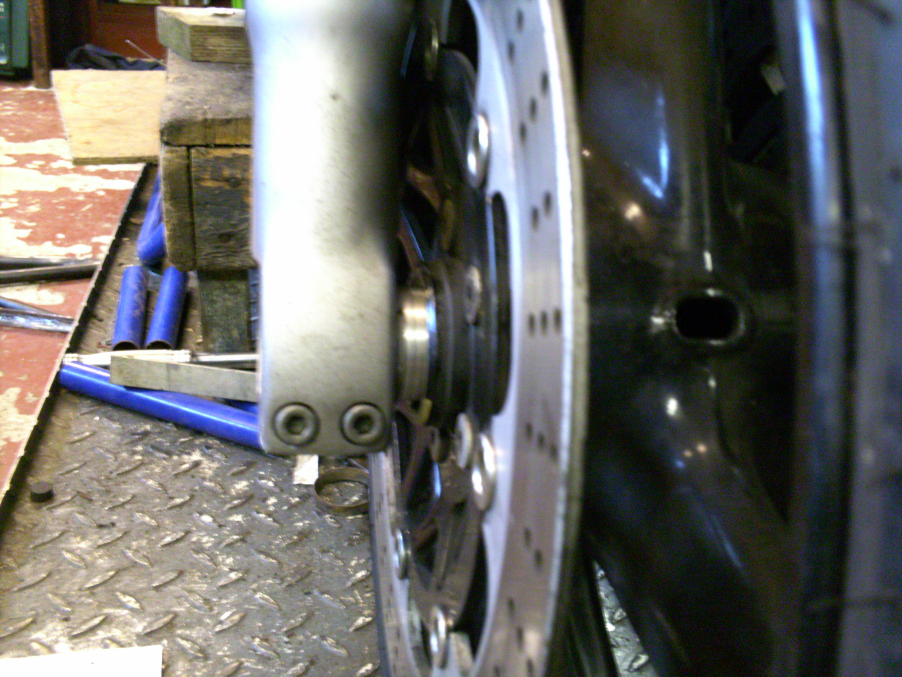 The chunky Yam lower legs run close to the wheel and won't allow the use of the dished Kwak brake discs so i'm going to have to either find some that fit with less offset or more likely make up some adaptors for some flat XJR ones or the like.