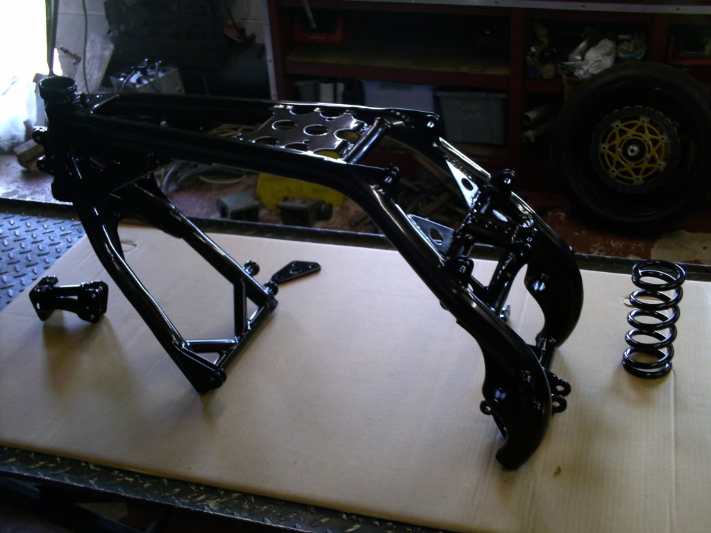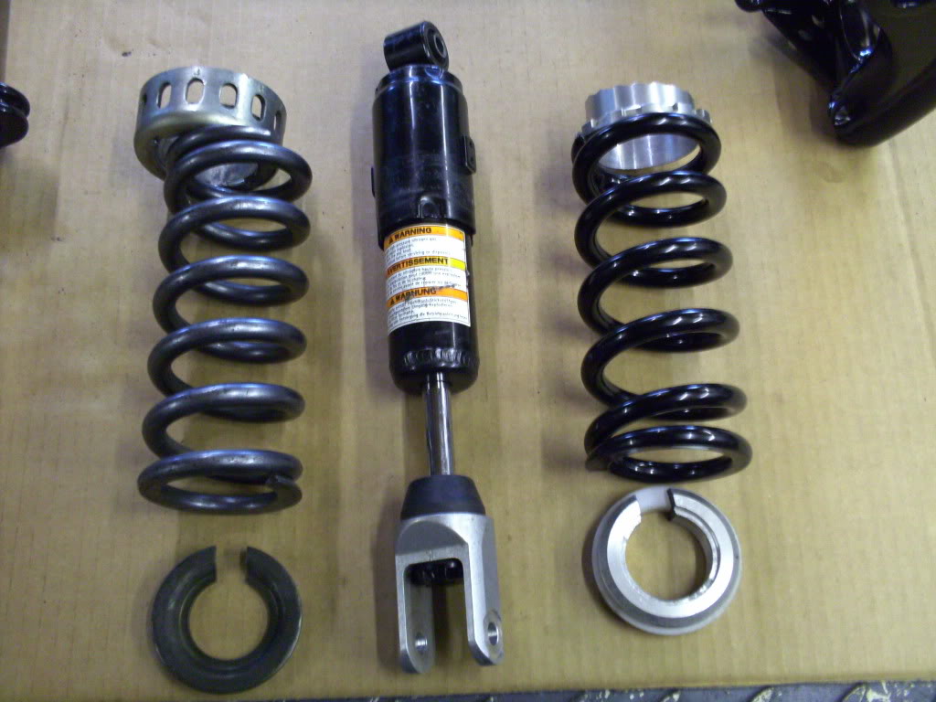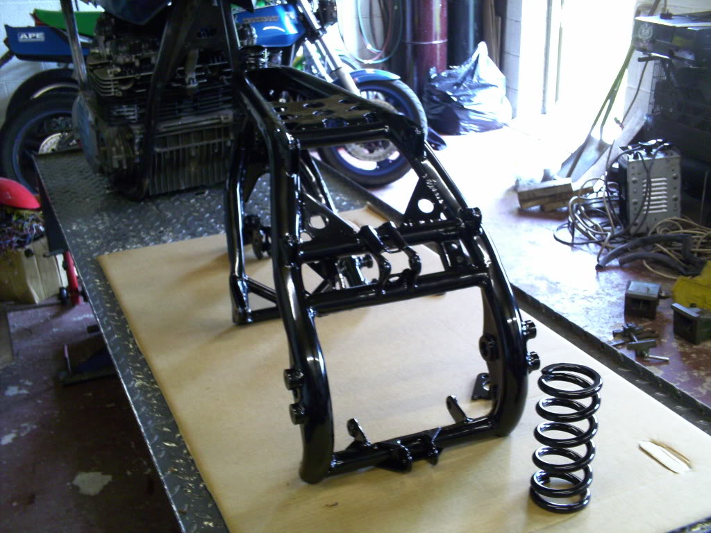Replaced on right by softer Yam R6 spring that is slightly larger diameter so used much nicer alloy R1 preload etc to suit which also needed some Lathe adjustment to fit the fatter bandit damper.