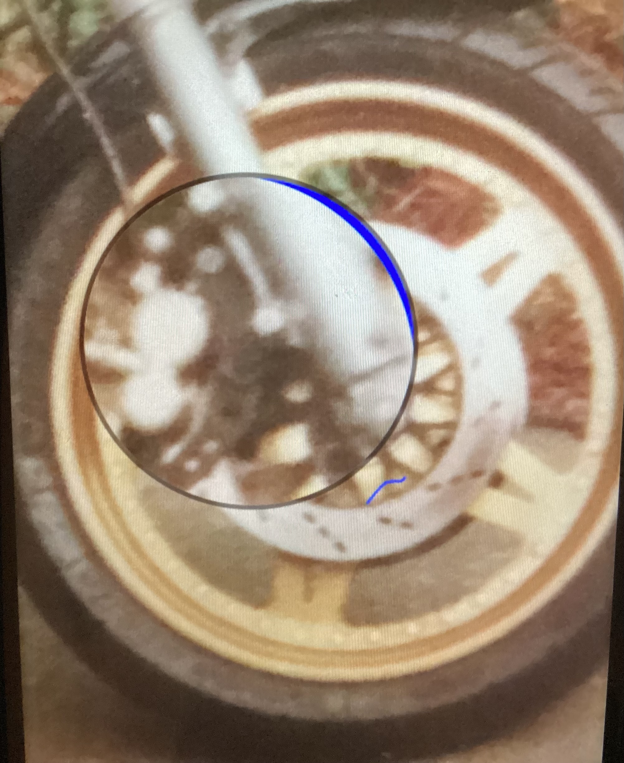 Hopefully you can just about spot the lower edge of a flat 5mm thick steel plate sandwiched between the ZX10 calliper carrier bracket (bit with holes visible in pic) and the z1000 fork leg lugs.