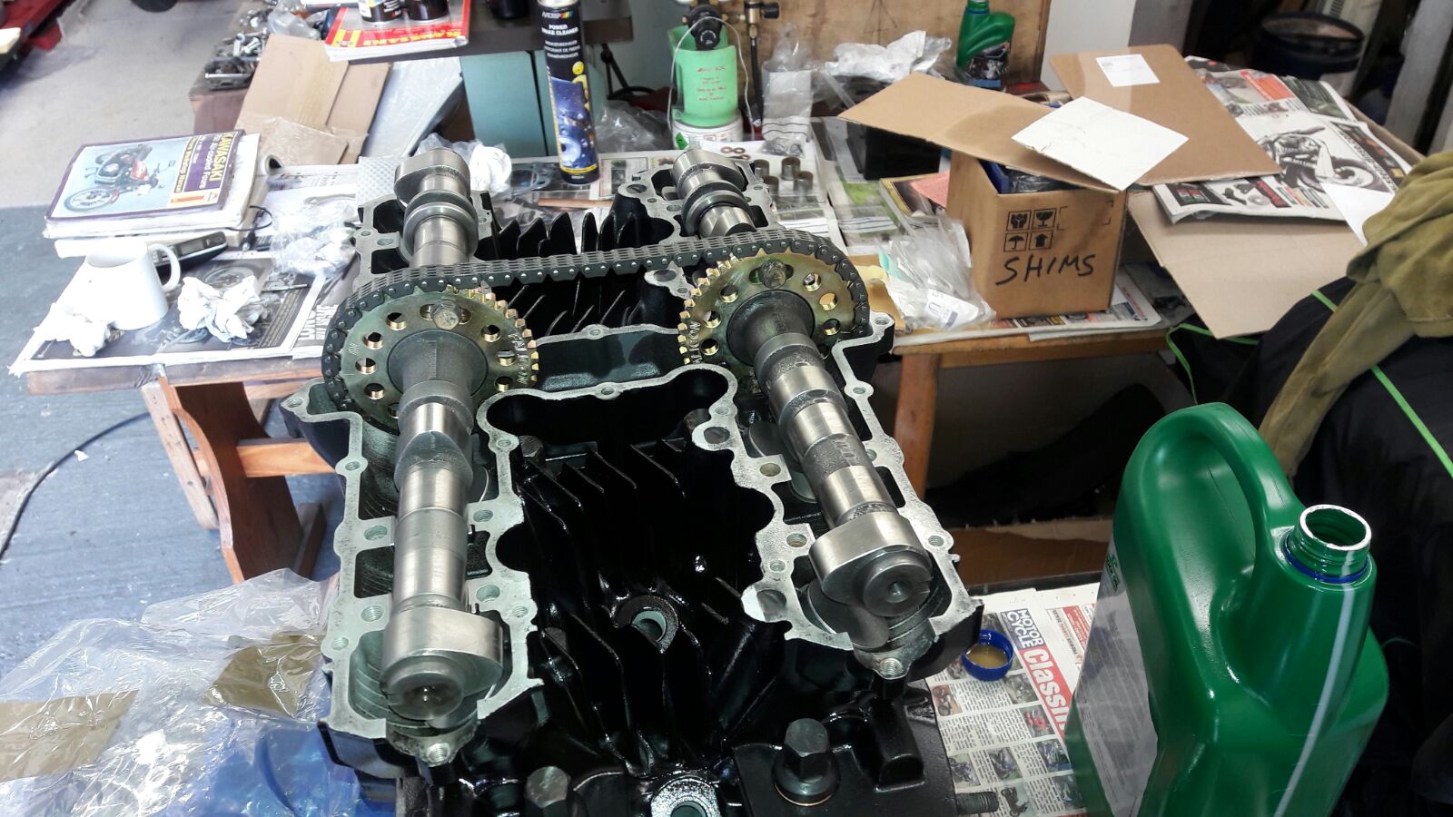 ok quick up date head has had new seats cut, vale guides installed and had ports matched/stage 1 flowed all done by Roger Upperton. new valves, springs, followers fitted along with slotted sprockets new cam shells and the cleaned up and deburred cam. head bolted on with hd studs and nuts