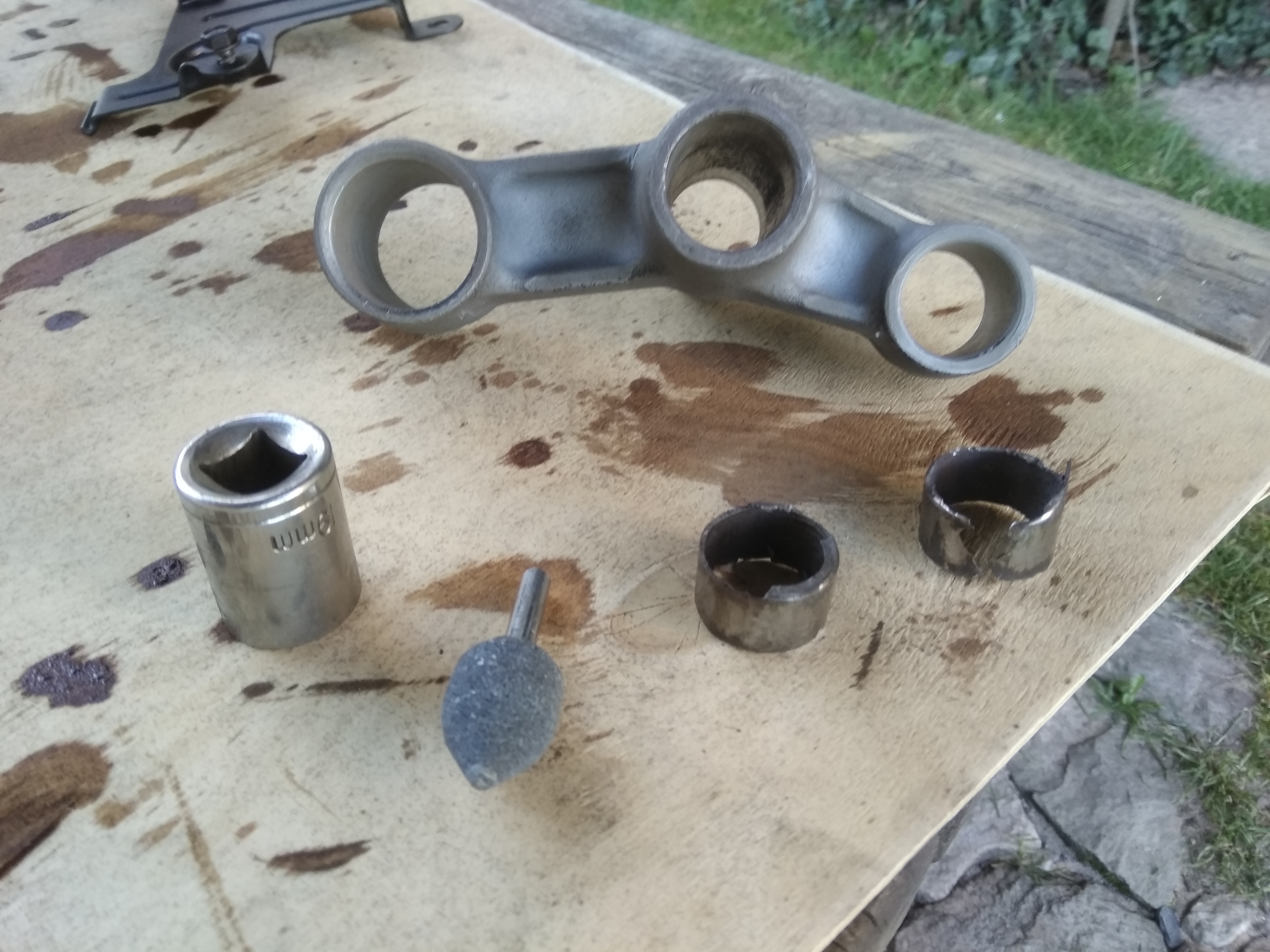 45 minutes with a rotary grinder on my drill for the first one, then realised that there isn't a shoulder inside and found a 19mm socket that had an OD 0.2mm less than the bore, second one 20 seconds, happy days. Quick sand blast. I'm going to fit a grease nipple.