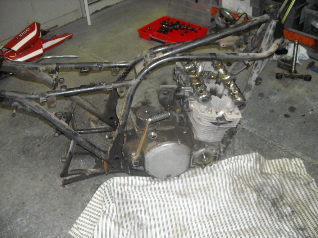 I allso dismounted the camshafts to get a bit more clearance between the engine and the frame and I laid it down on its right hand side.