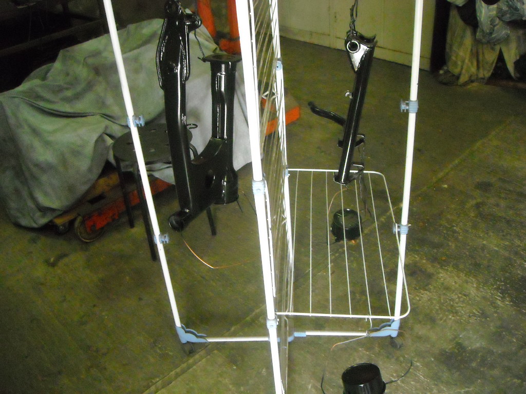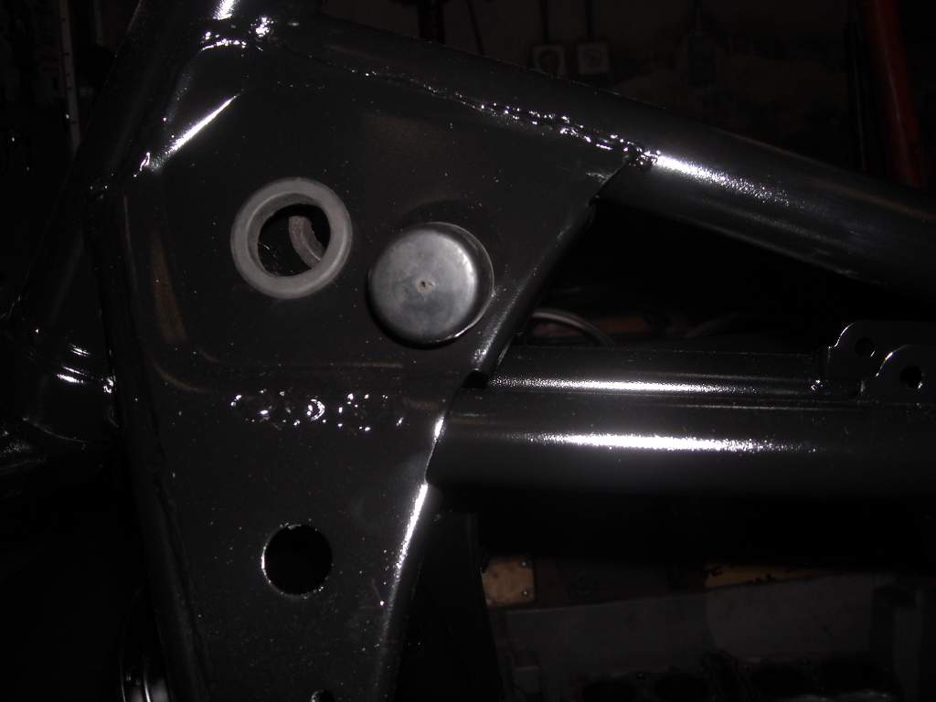 The holes in the frame are cleaned and paint is removed so the swing arm shafts can slide.
