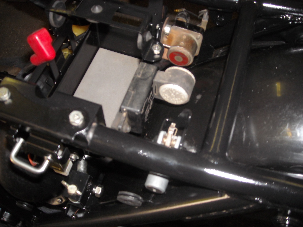Before installing the battery box, attach the IC igniter on the underside of it, that’s much easier before the battery box is installed in the frame You can also mount the starter solenoid before installing the battery box in the frame.