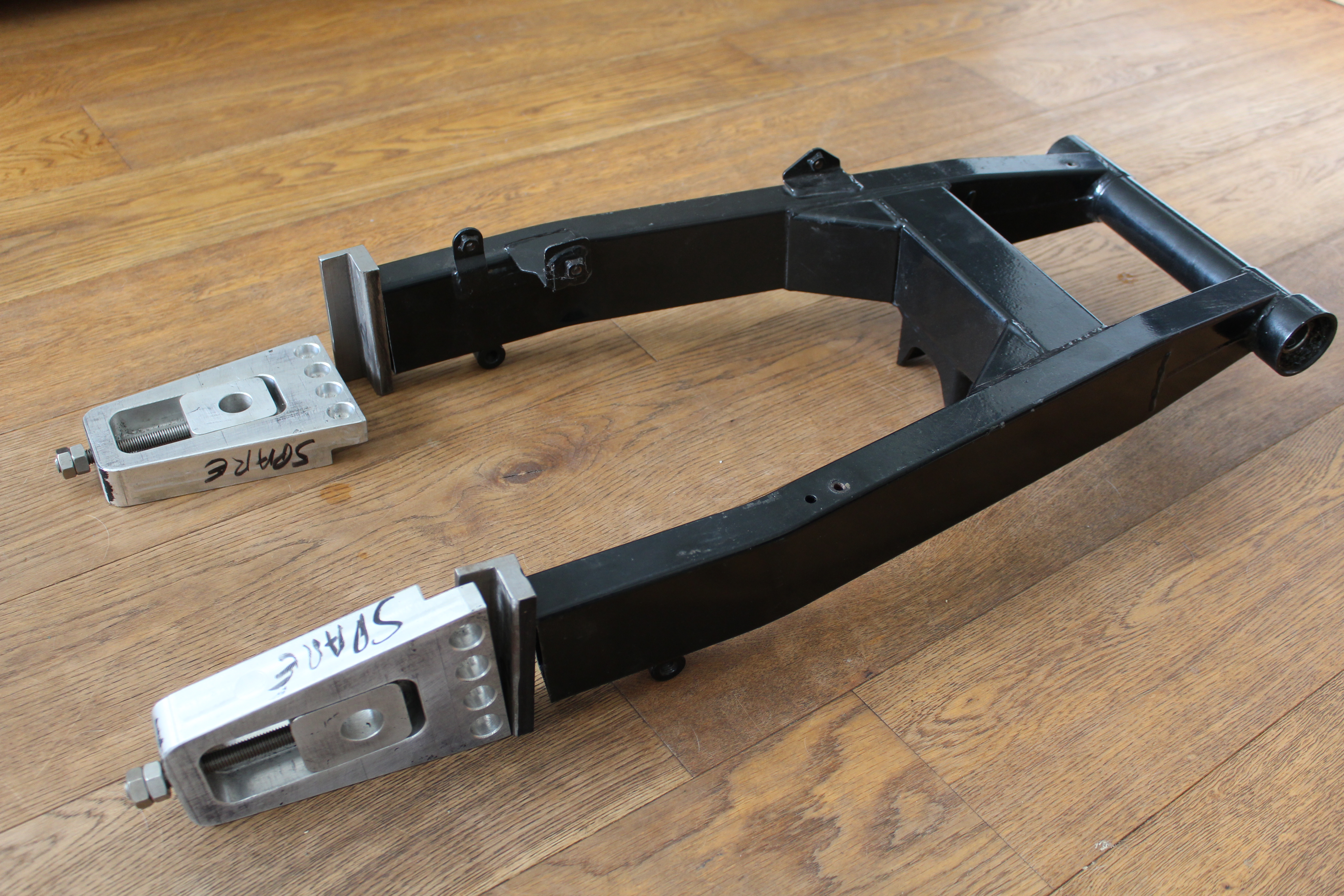 In the photo you can see that the new alloy adjuster blocks are far too wide for the swingarm, but that's ok, as the extra will be needed when we add an under brace to the arm.