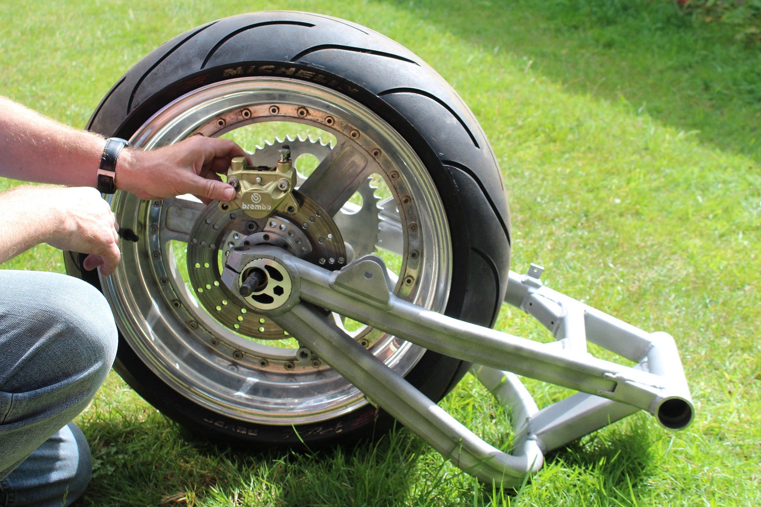 The obvious answer would be to buy a pair of 17 inch alloys from a modern-ish sports bike, and that's an option for the future, but in the meantime I didn't have to look far to find a pair of wheels to use for now. I had a pair of billet wheels (made by my mate years ago), which had come off my old drag bike. The rear came with a new sprocket and a disc, and with new spacers, a one off brake mount and the Brembo off the drag bike, the back end was coming together..