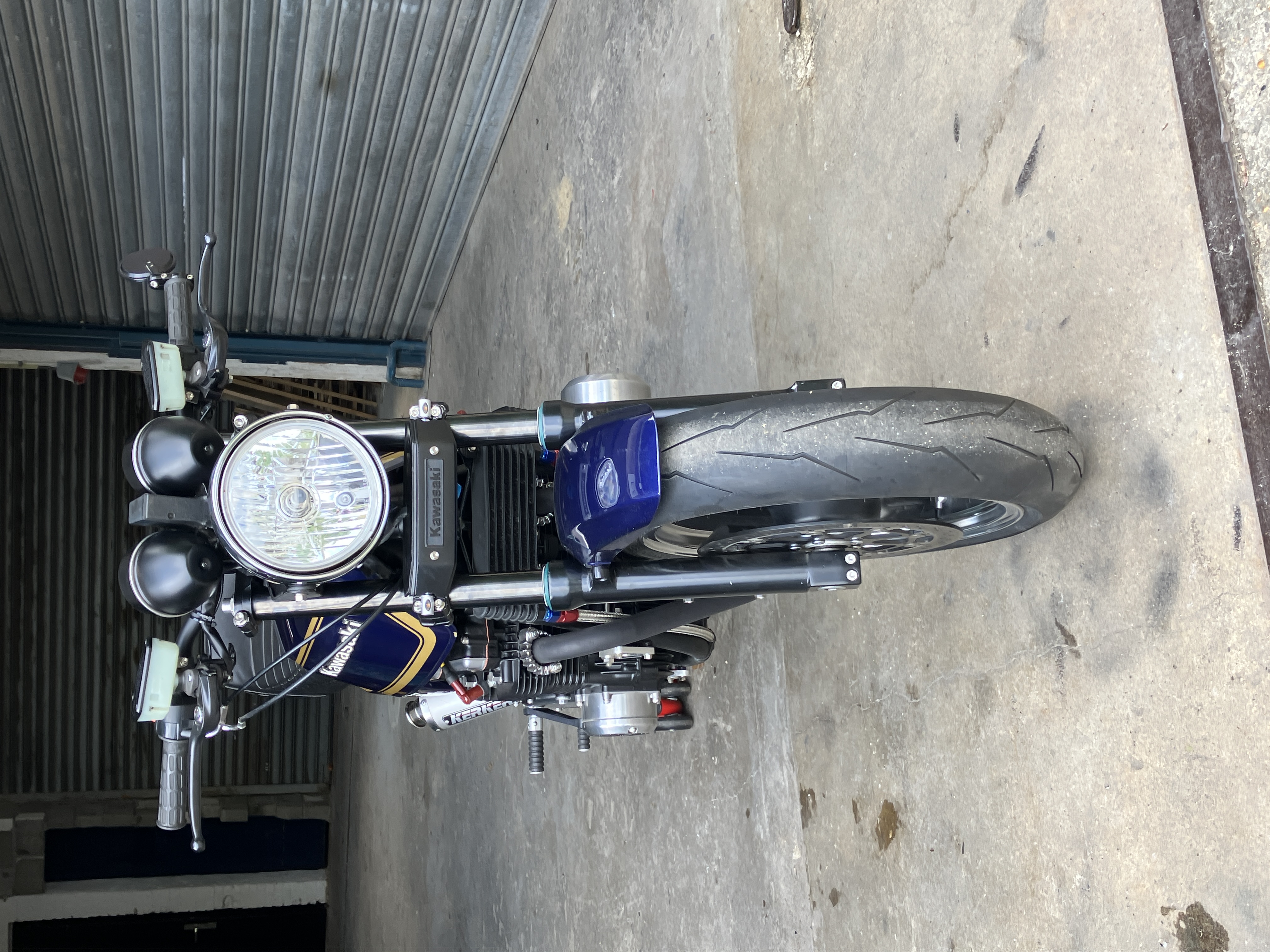 Together with a friend of mine we built this Z1000ST resto mod. It took us almost 5 years to get as far as this as we only worked on saturdays when we both had time. Drank some beers too. We decided to make it look like the MK2 but fitting MK2 parts to the ST made us realise that was too much work just for the looks. So we had the complete ST bodywork painted in MK2 colors but with more metallic in the blue and gold. Much to our surprise it turned out stunning. The stock frame has been modified for the ZX10R monoshock and home made link system with adjustable dog bones for a B-King. The VFR 750 single sider swingarm with Triumph hub and wheel has been fitted using bushings/spacers between frame and swingarm to get the rear wheel in line. Offset front sprocket to get the rear sprocket in line. The offset was big but we don't like the existing outrigger plates that are for sale, so we welded the support for the outrigger bearing inside a later Kawasaki engine cover. We used larger sprockets (19T up front) than normal to prevent the chain from touching the swingarm. Front forks are ZRX1100 with DLC coating , ZRX1100 front wheel with radial Brembo calipers on adapters and KTM Superduke discs on adapters. Both wheels painted like the MK2: black and with polished sides. We found some nice GTR1400 radial master cylinders left and right. Fitted 2004 Blade switch gear which turned out to be a pain in the neck as they normally talk with the ECU which does the rest. All modern electrics with MK2 replica wiring harness and modern fuse box. Headlamp glass is clear. Home made footrest brackets with Tarozzi shifter and brake lever with billet master cylinder. the Laser exhaust has a muffler on the right and a remote operated valve on the left. Electronic Speedhut gauges in stock surroundings (holes welded shut) and GPS antenna. Engine rebuilt , hydraulic clutch. Oil cooler with thermostat and also titanium and stainless bolts and nuts on frame and engine and handmade engine brackets ... Frame painted mat black and that looks greats. Biggest setback were the electrical connectors from Louis in Germany which took us almost 9 months (and some beer) to figure out that the electrical Gremlims were caused by them. Once swapped with good ones (which were bigger sadly) all fell into place. The bike now gets brake lines and is then ready for start-up.