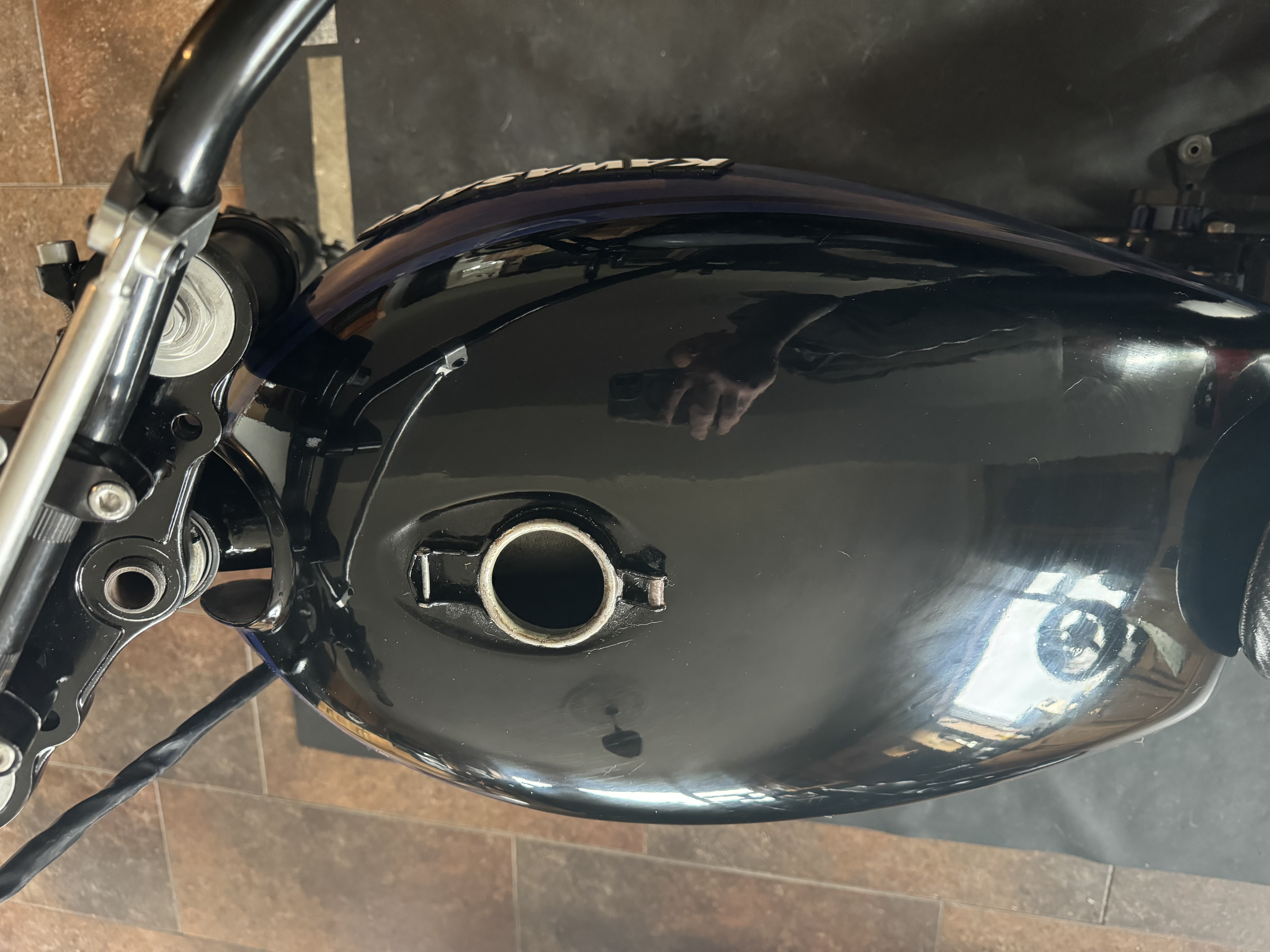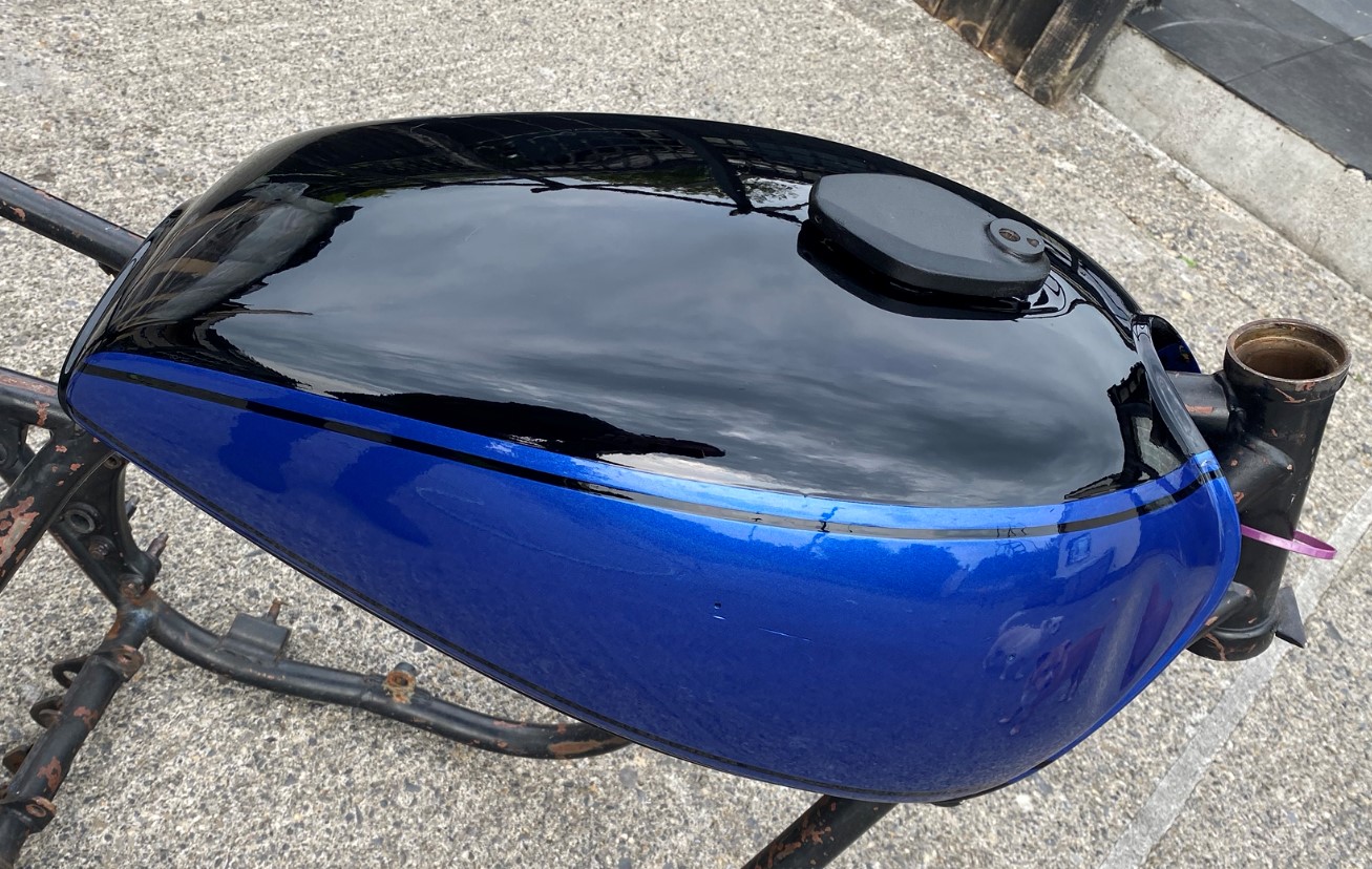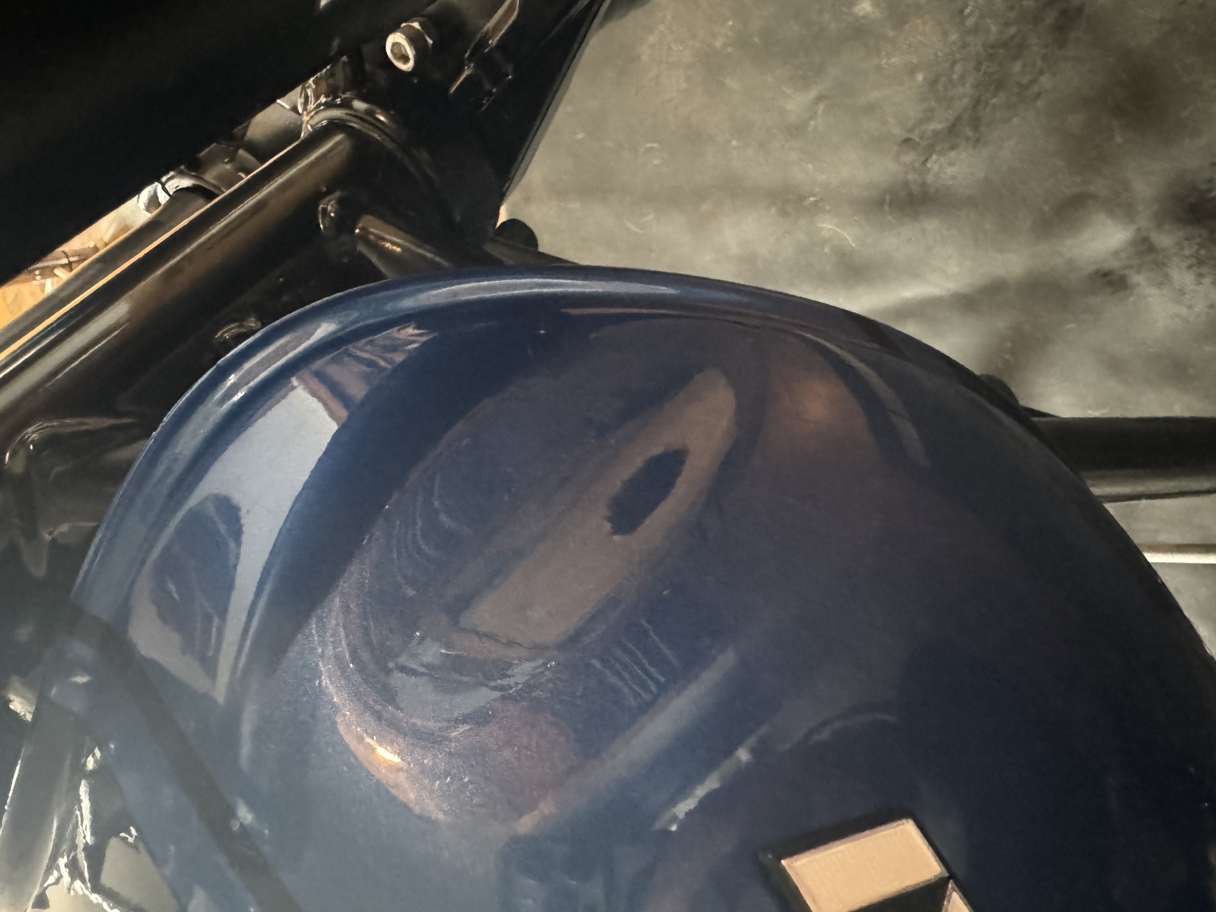 The dimple is fairly hard to see and the paint job i did is to hide it in the blue, the paint scheme is a nod to the blue z1000 A1. Here it is after clear coat last year, you can just about make out the dimple.