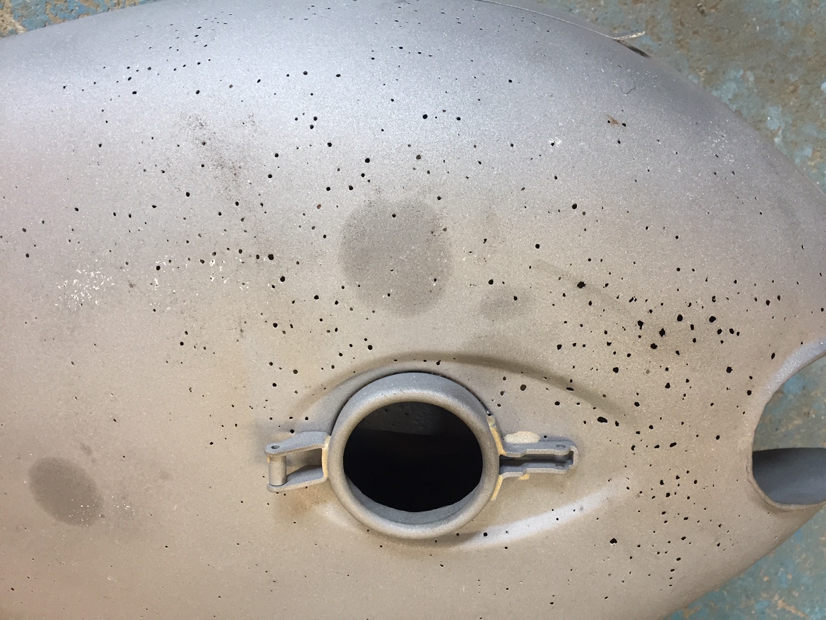 I was about to send the paintwork off for a respray when I had second thoughts on the tank so just for good measure I had it blasted. OMG what a mess ...hundreds of pin holes in the top and the curved bit underneath which fits over the frame tube. Amazingly the bottom was virtually hole free and it might have patched with a good coat of epoxy liner and some filler but did I really want to risk a (at some future date) £20k bike under a leaky fuel tank. hmmmmmm.....NO. dk came to the rescue with a nice one (albeit a Z1a) so now just need to get the badge mounts modded.