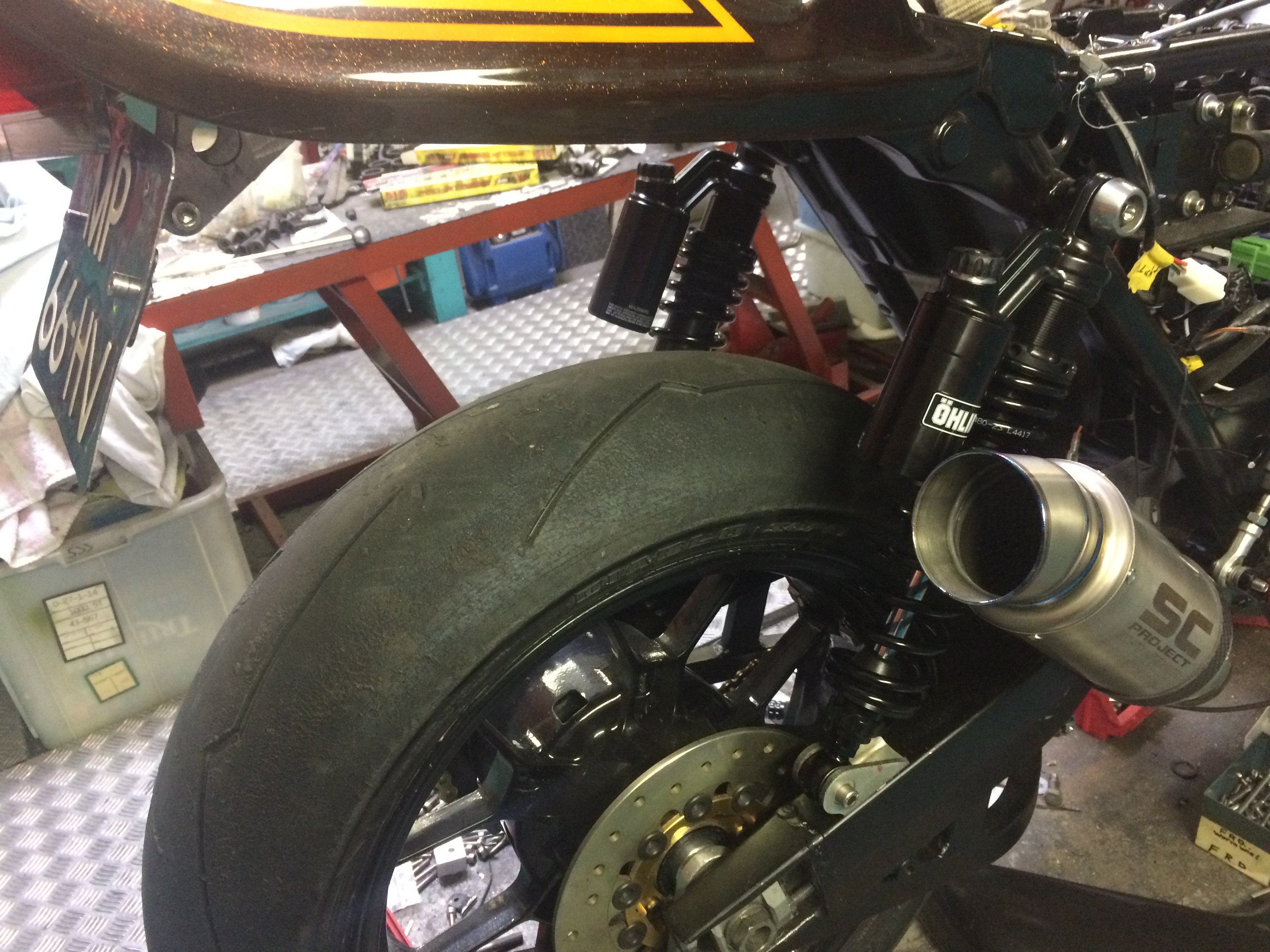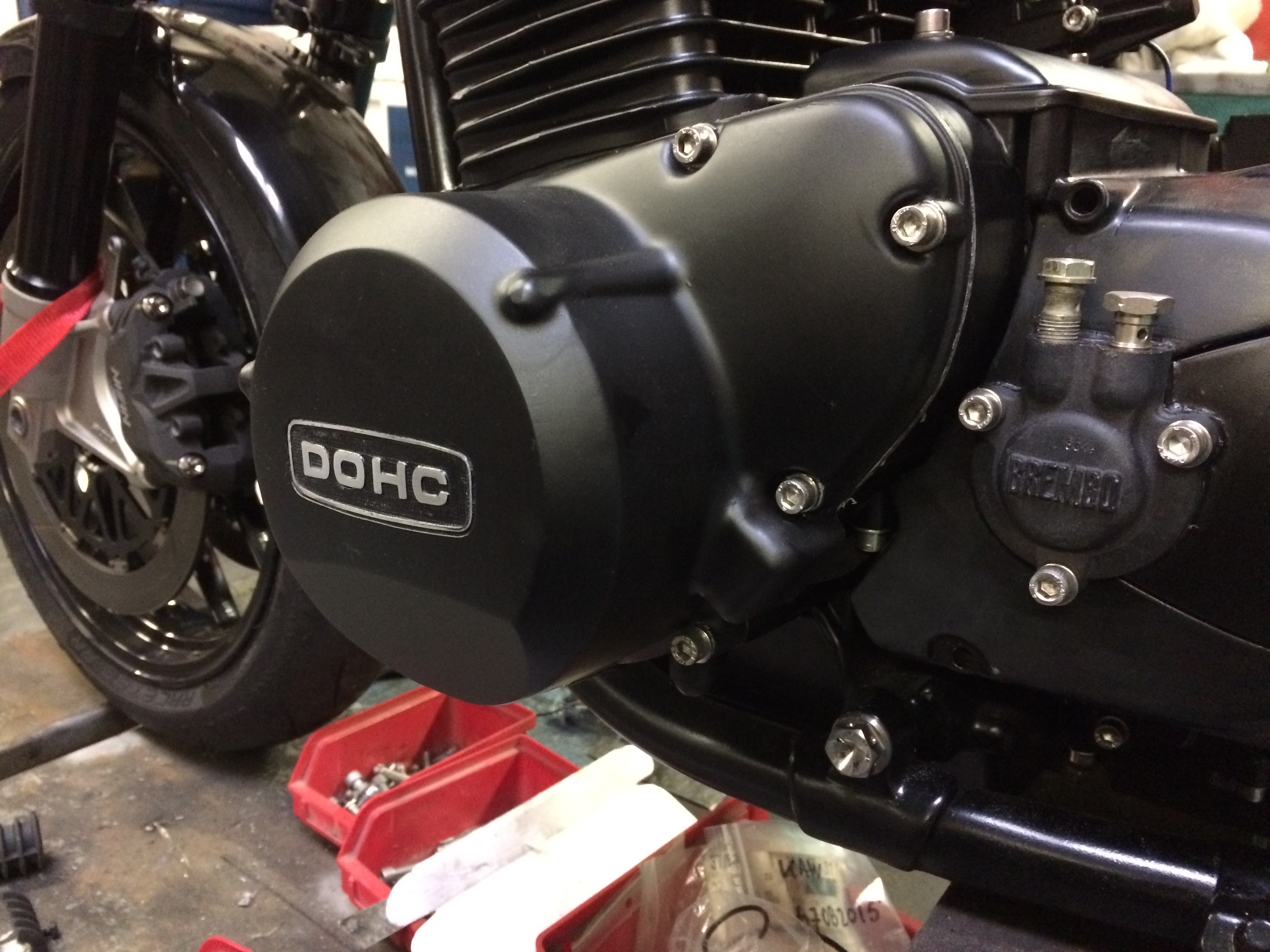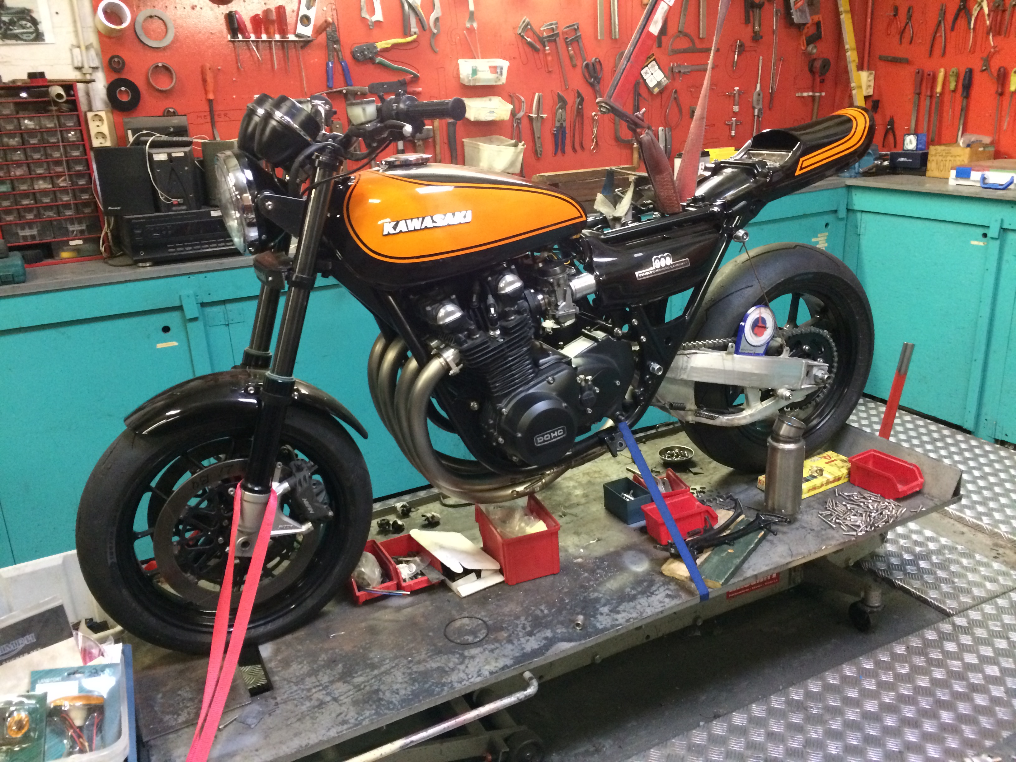 Sanctuary look-a-like. It is a ‘73 with a heavily braced frame, Aprilia Y-spoke wheels, 332mm WSBK discs, DLC coated Showa fork (no USD) with radial calipers (still looking for GP4RX in 108mm), electronic tach and speedo by GPS, fatbar, modern switchgear from R1 and Blade, Brutale 910R master cylinders left and right, all visible nuts and bolts except for the engine are titanium, hand made engine brackets, engine is mostly stock but with 1000cc, hydraulic clutch (Brembo slave cylinder) and modified ignition and alternator cover, 31mm CV carbs, Blade coils, ‘76 wiring harness with modern fuse box, K-factory exhaust with SC muffler, all engine bolts and nuts are stainless. Bimota rear brake with KTM master cylinder and Brembo caliper, heavily modified TL1000R swingarm, 520 chain and sprockets, and a lot more I forgot to mention ..... I am still on the look out for some neat rear shocks and seat will be hand cut like the older superbikes ...