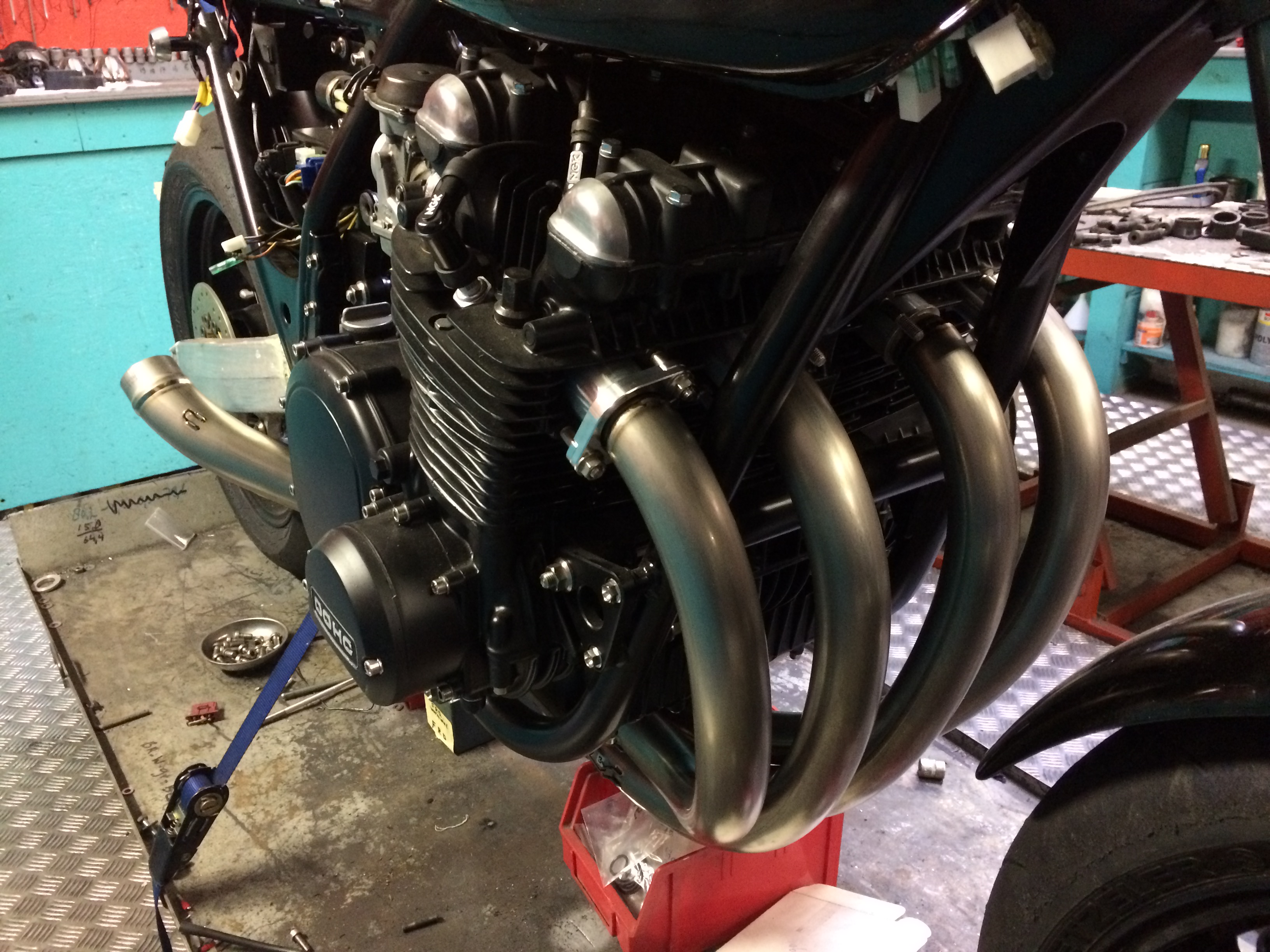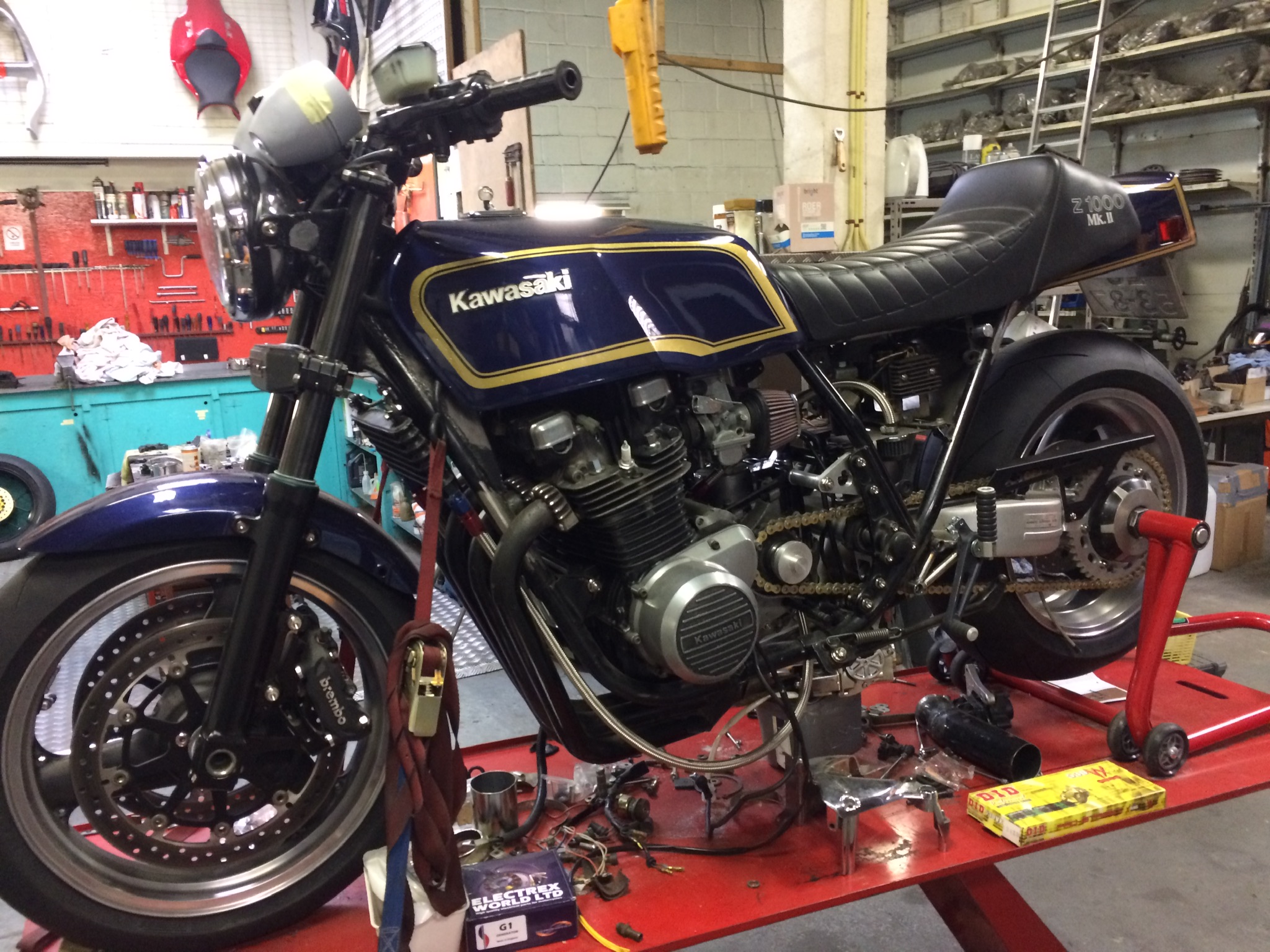 And some pictures from the ST converted to MK2... stock ST bodywork in slightly modified MK2 colors, frame modified for VFR single sider swingarm with Triumph hub and wheel, ZX10R monoshock and homemade link system with adjustable dog bones. ZRX1100 forks with DLC coating , radial Brembo calipers on adapters and KTM Superduke discs on adapters. GTR1400 master cylinders left and right, modern Blade switch gear. All modern electrics with a MK2 replica wiring harness and modern fuse box. Home made footrests with Tarozzi shifter and brake lever. Exhaust has a remote operated valve but not entirely sure if it stays.. Electronic Speedhut gauges in stock surroundings and GPS. Engine rebuilt , hydraulic clutch, 19T up front comes with outrigger bearing welded in stock looking engine cover. Oil cooler with thermostat and also titanium and stainless bolts and nuts on frame and engine and handmade engine brackets ... Frame and engine still to be painted..