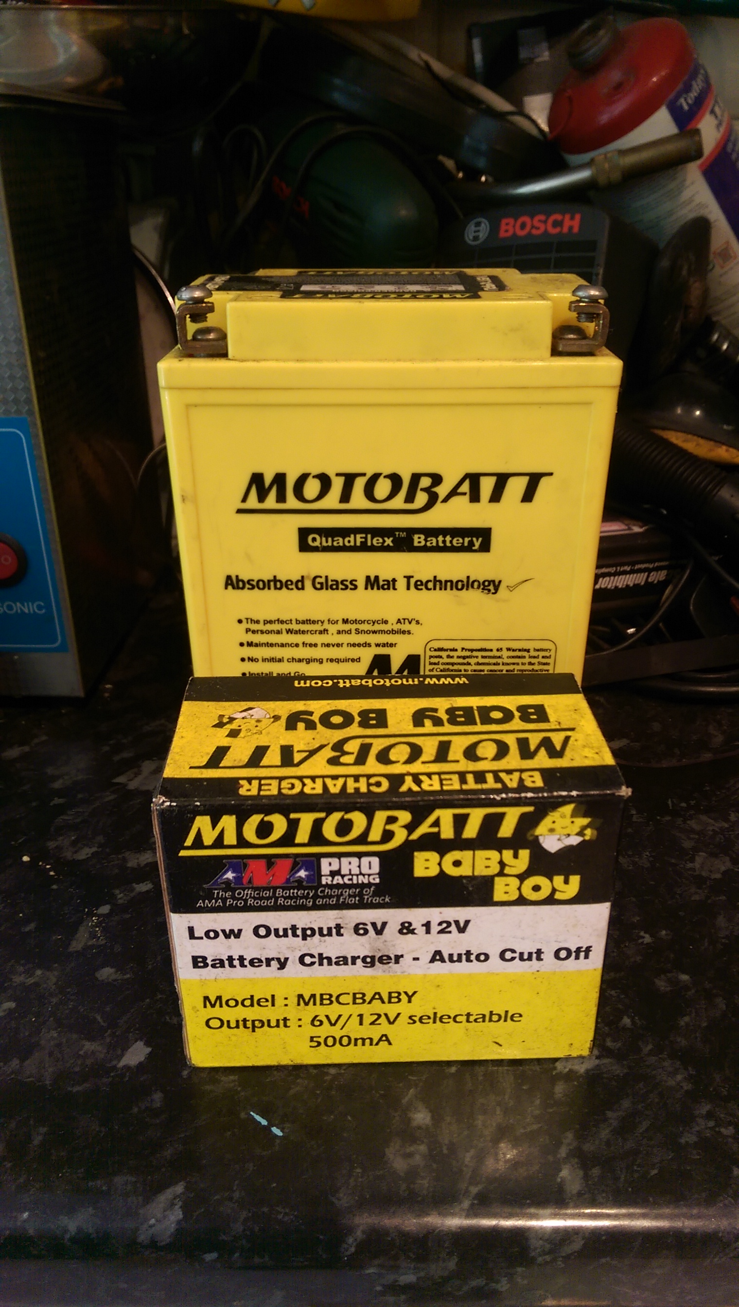 Word of warning..... when you lay the bike up over winter, DON'T USE A normal battery charger... will fry the battery.. motobatt do a trickle charger called baby boy, and there about £20 quid.. & there yellow too.. 70amps cranking power..