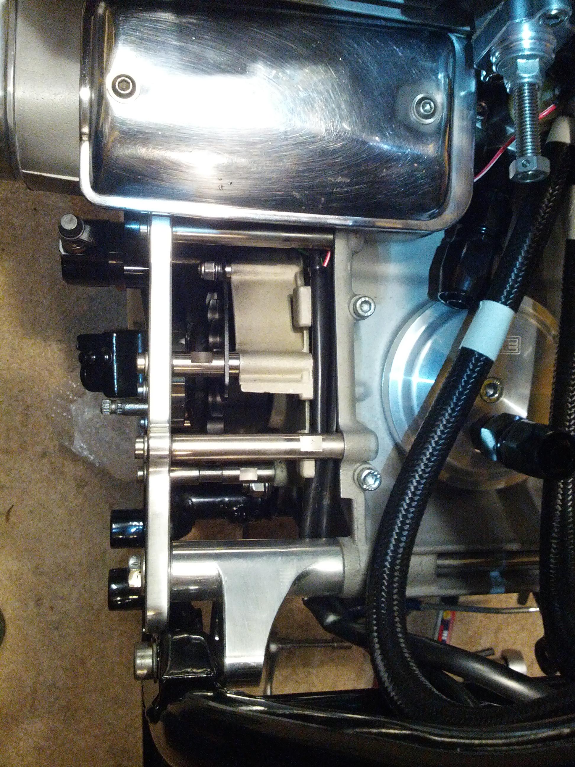 Then it was time to install the 1" offset sprocket, and bearing outrigger assembly including Oberon Ducati Panigale clutch master cylinder: