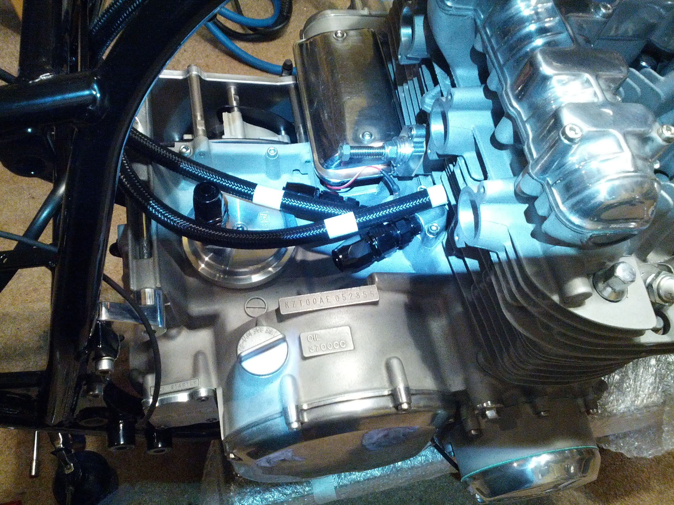 I used the time tested method of laying the engine on its side and me and the mrs. lowered the frame over the motor and started installing all the engine mounting hardware: