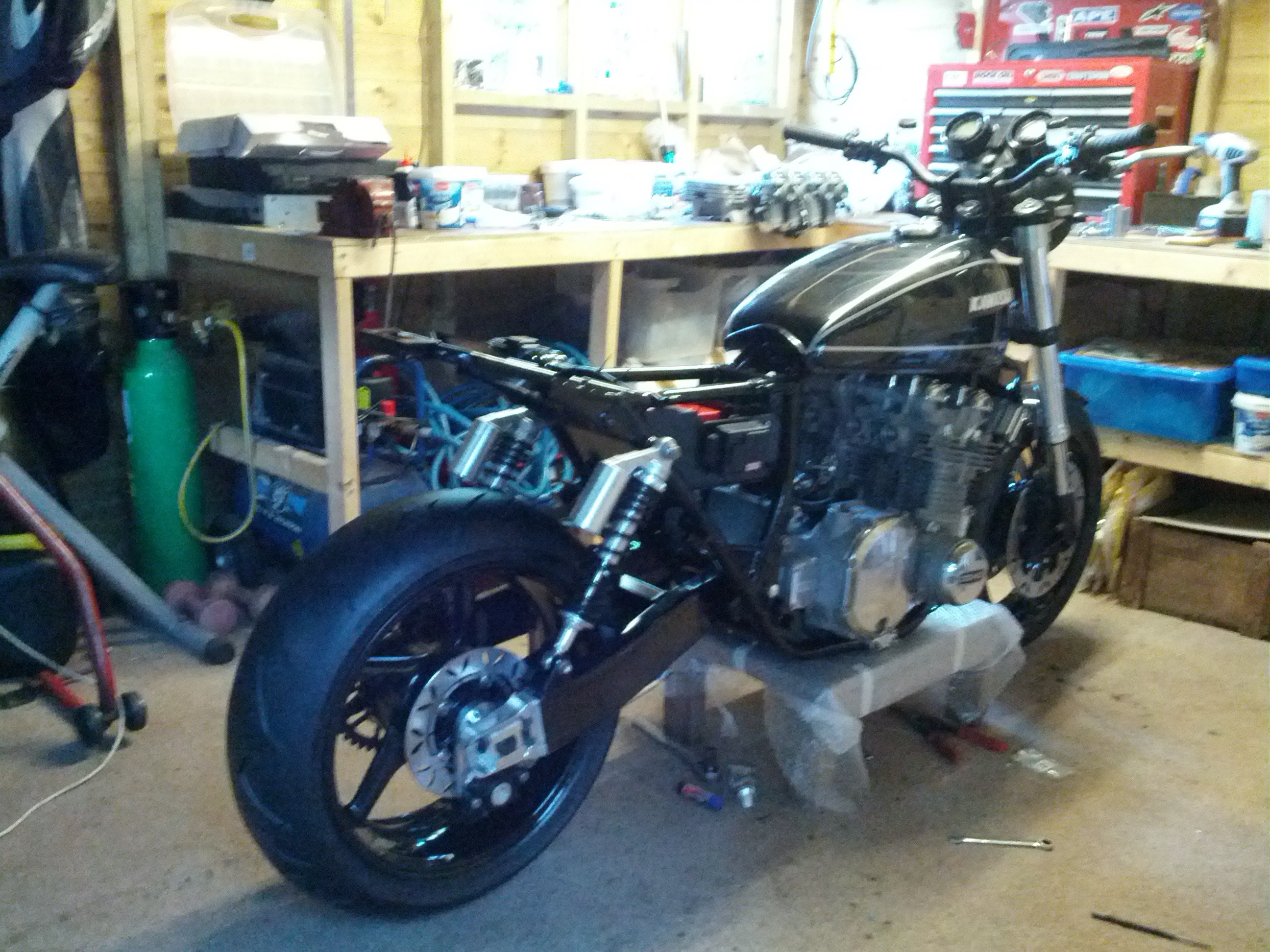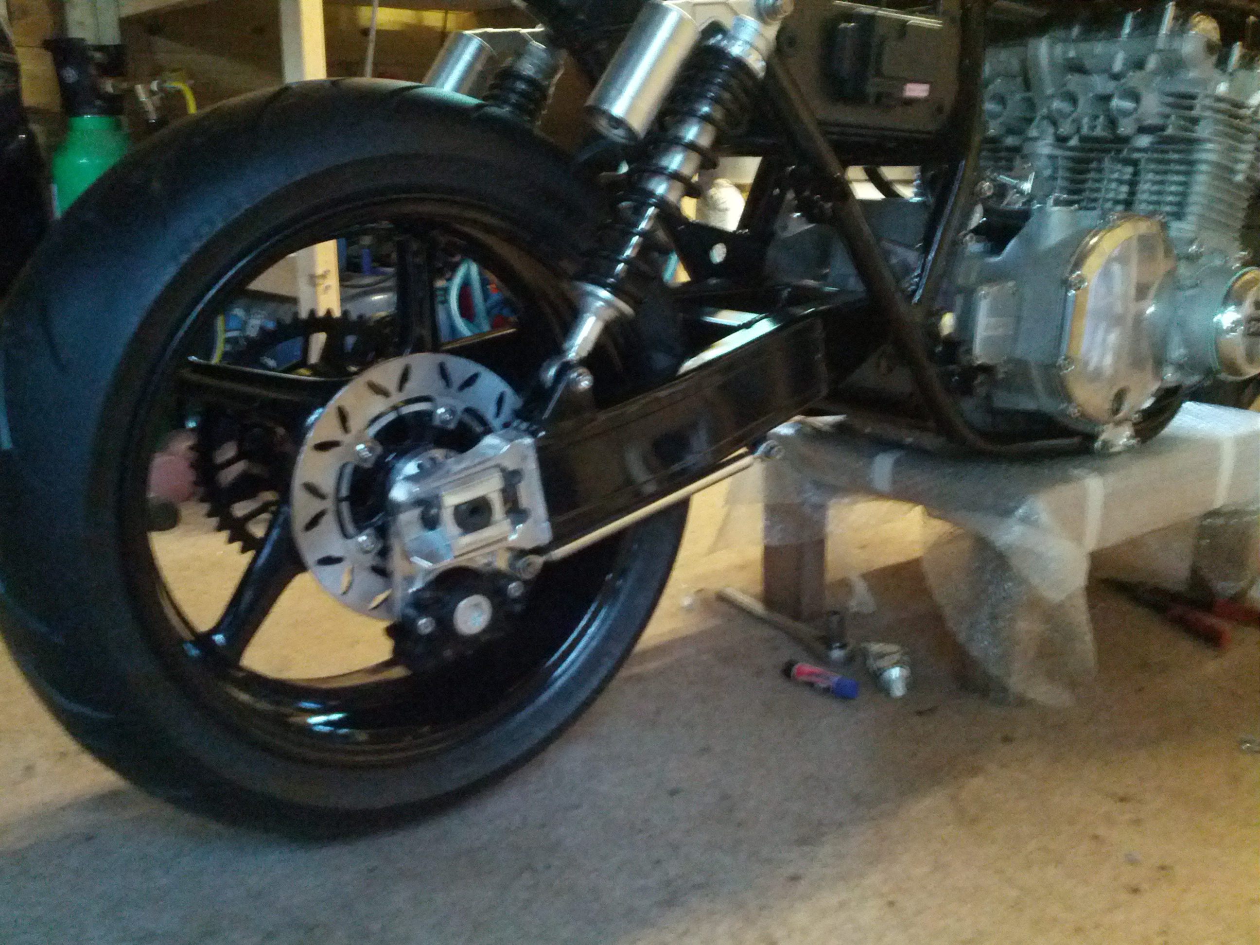 You can see from the last picture i posted that i slung the rear wheel in, including the rear caliper and hanger and torque arm: