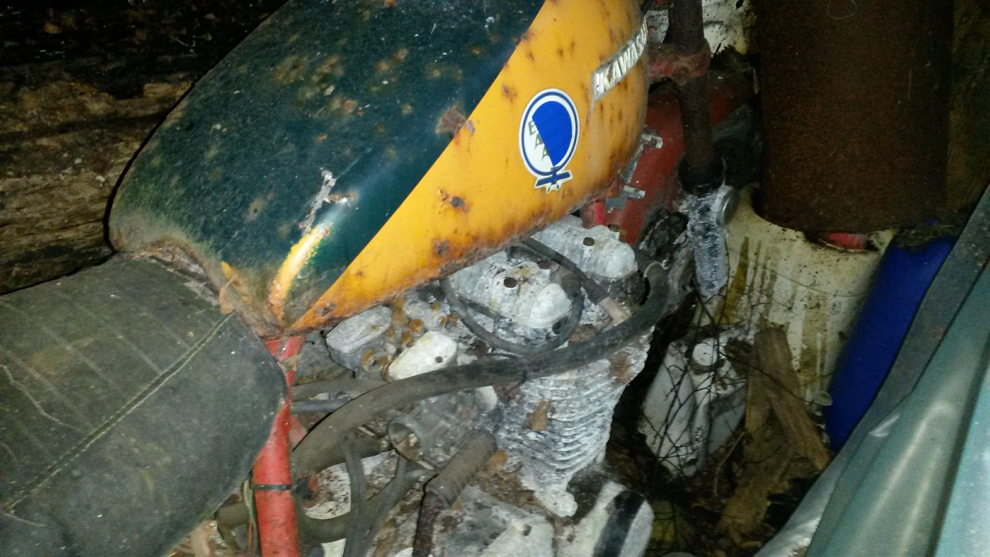 Just now i'm posting a few photos to let people see the state it was in when we finally dragged it out over a pile of rotting wood and heaved it into a van using fence posts as levers. ( The adrenaline was flowing that day.) The bike went into the shed in May 1985, so 32 years of West Coast weather has taken its toll but it will eventually get done. Right now i'm looking for a 1973 Swing arm if anone has one?
