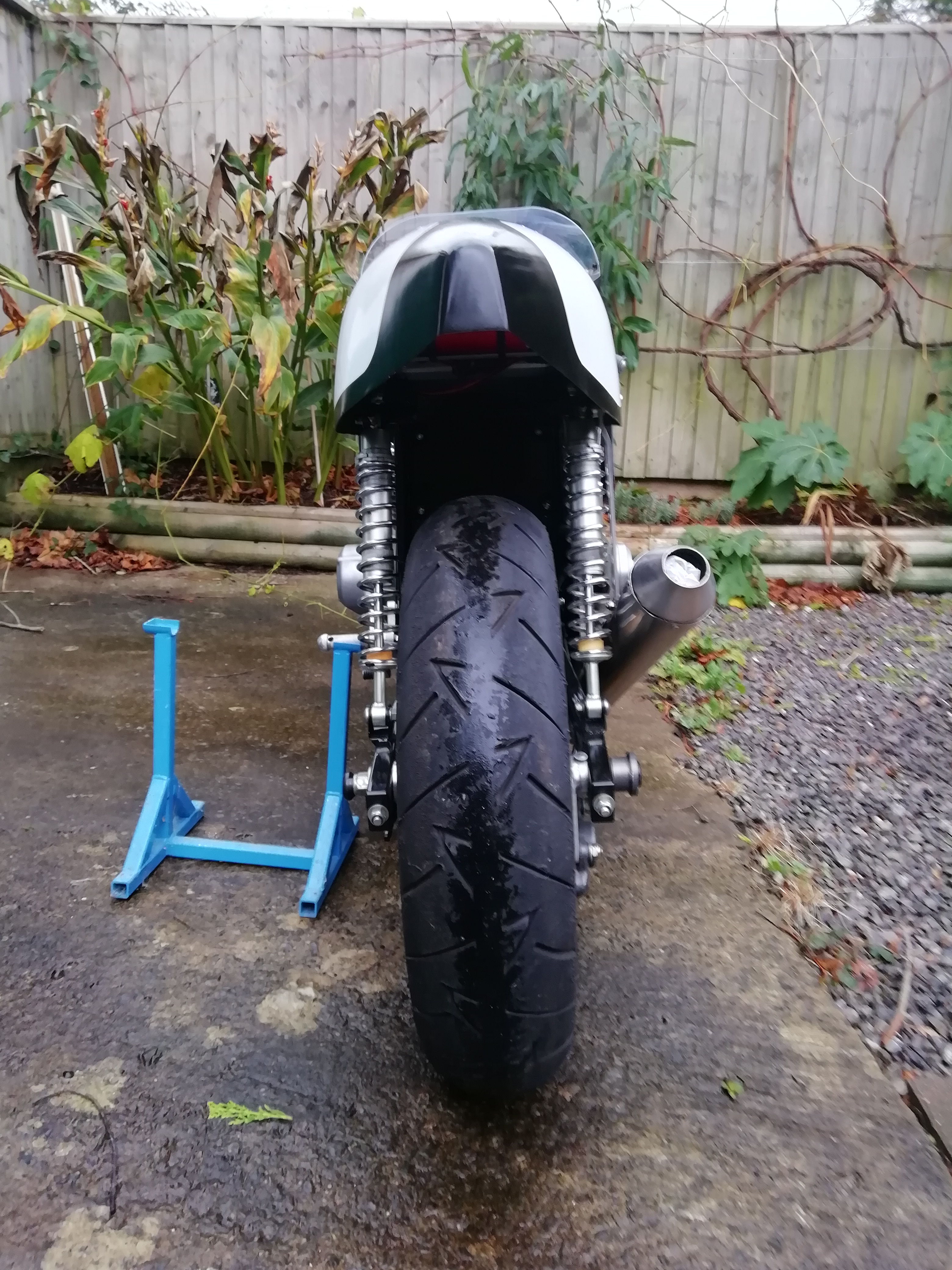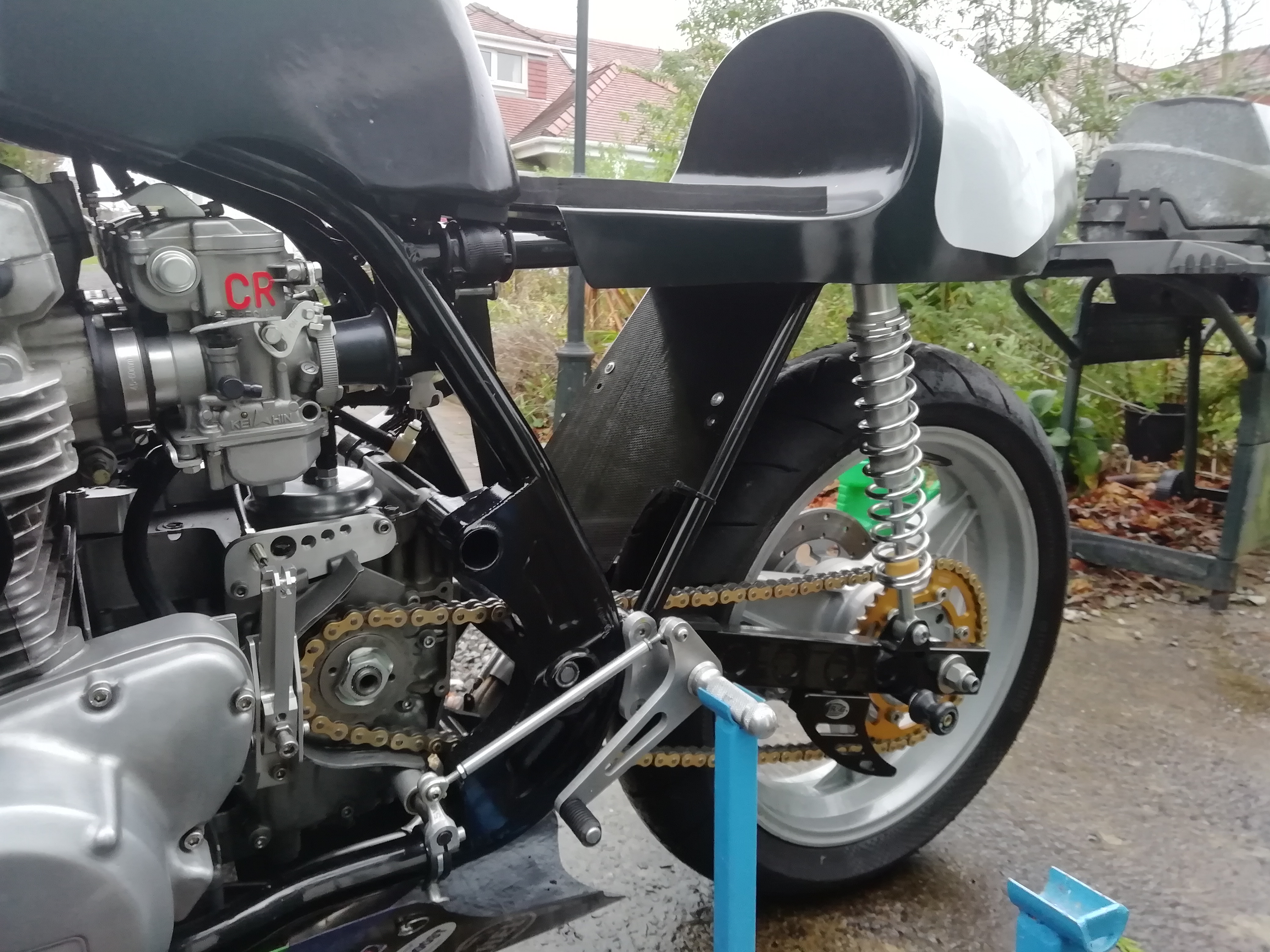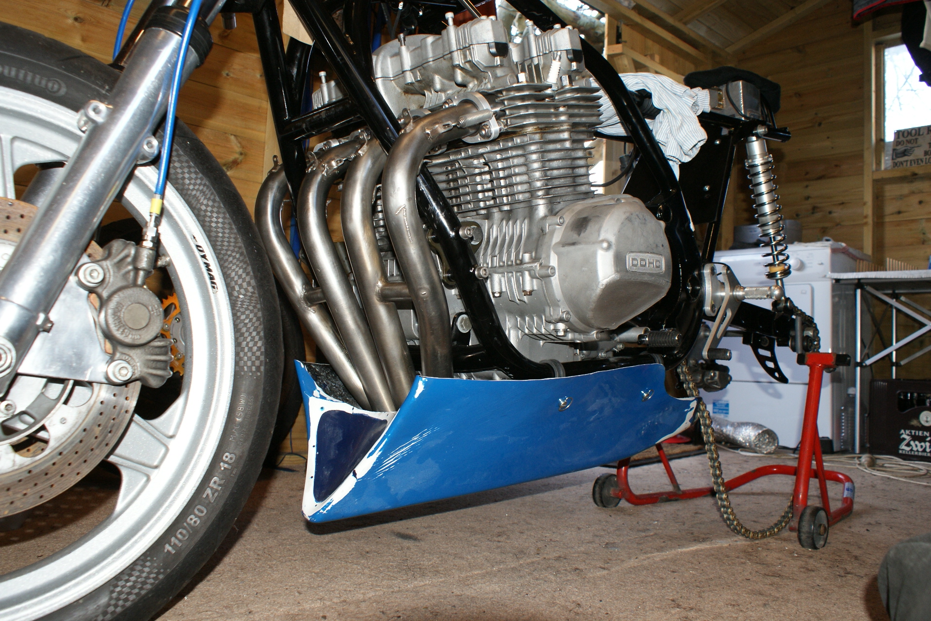 After trying to locate an endurance style belly pan that will actually fit the wide P&M frame and hold an engine full of oil and look the part i gave up and took the cutting disc to the "XR69" fairing that came with the bike:
