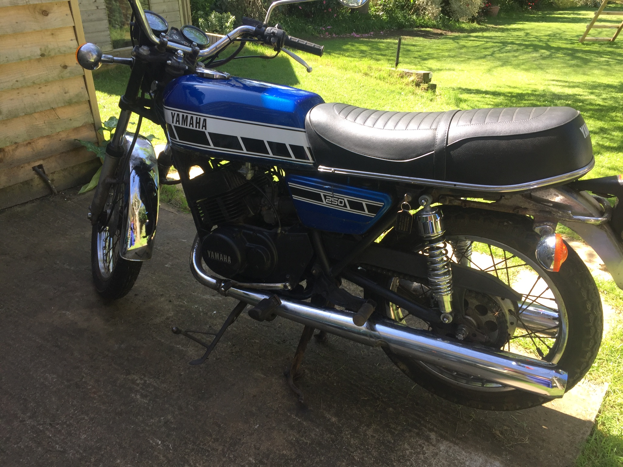 A blue RD250C. Very nice. I had one of those as my first learner bike. I got spat off it - the footrest bracket under the pipe would ground out - looked good at night though. I nearly became a human torch with it once, when the fuel tank balance pipe let go all of the fuel over a hot engine once. Nail it down the road, and it would leave a huge satisfying cloud of smoke in it's wake. Mind you, my 350LC I had after would do that as well :-) Great times.