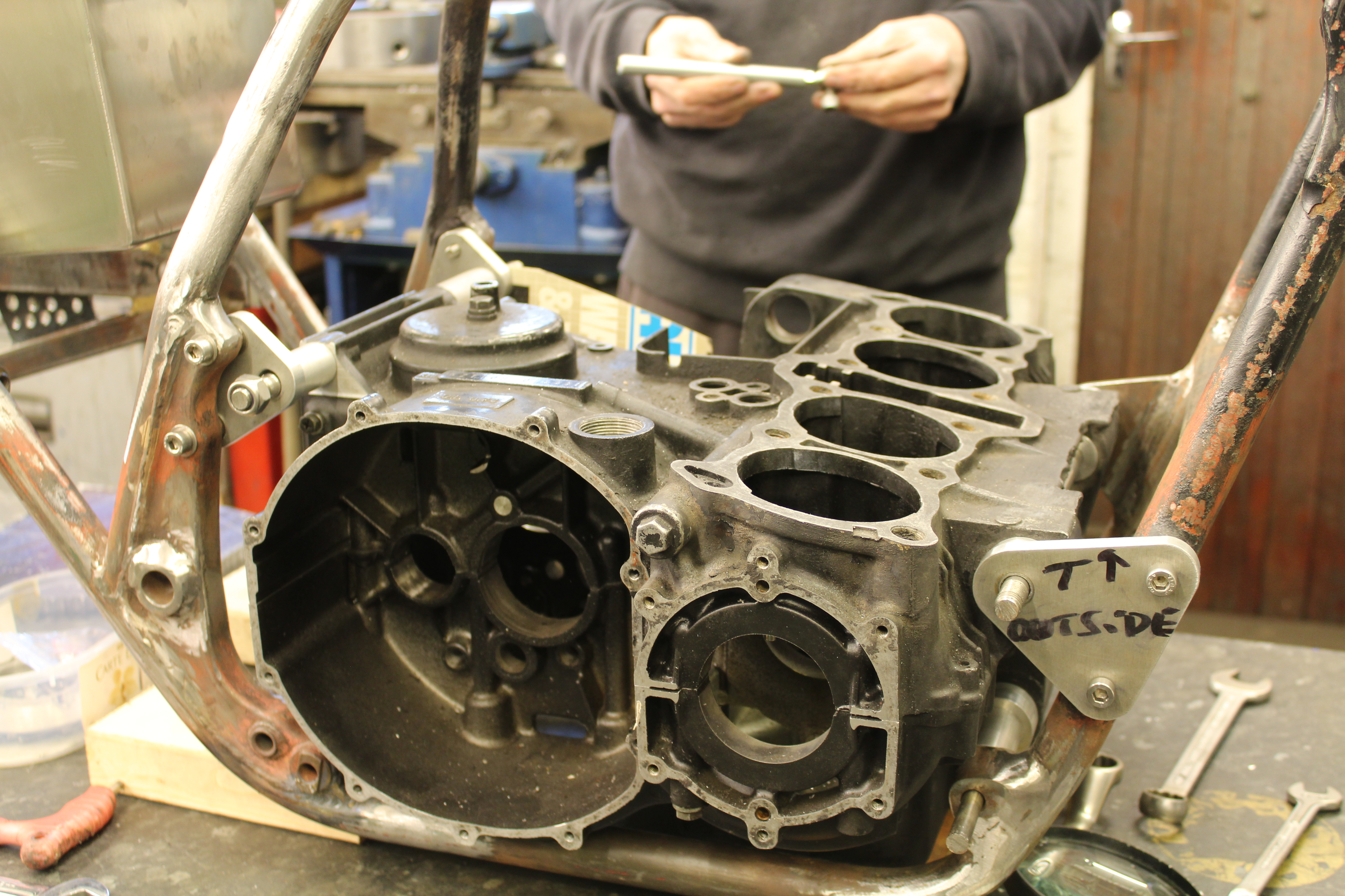 The stainless engine mounting bolts are now done, along with the their spacers. The rear 12mm mount was a lose fit in the cases, so the cases were taken out to 1/2 inch and a 1/2 bolt made, which is now a nice snug fit. Also the faces of the mounts of the cases have been milled flat, as they usually slope slightly.