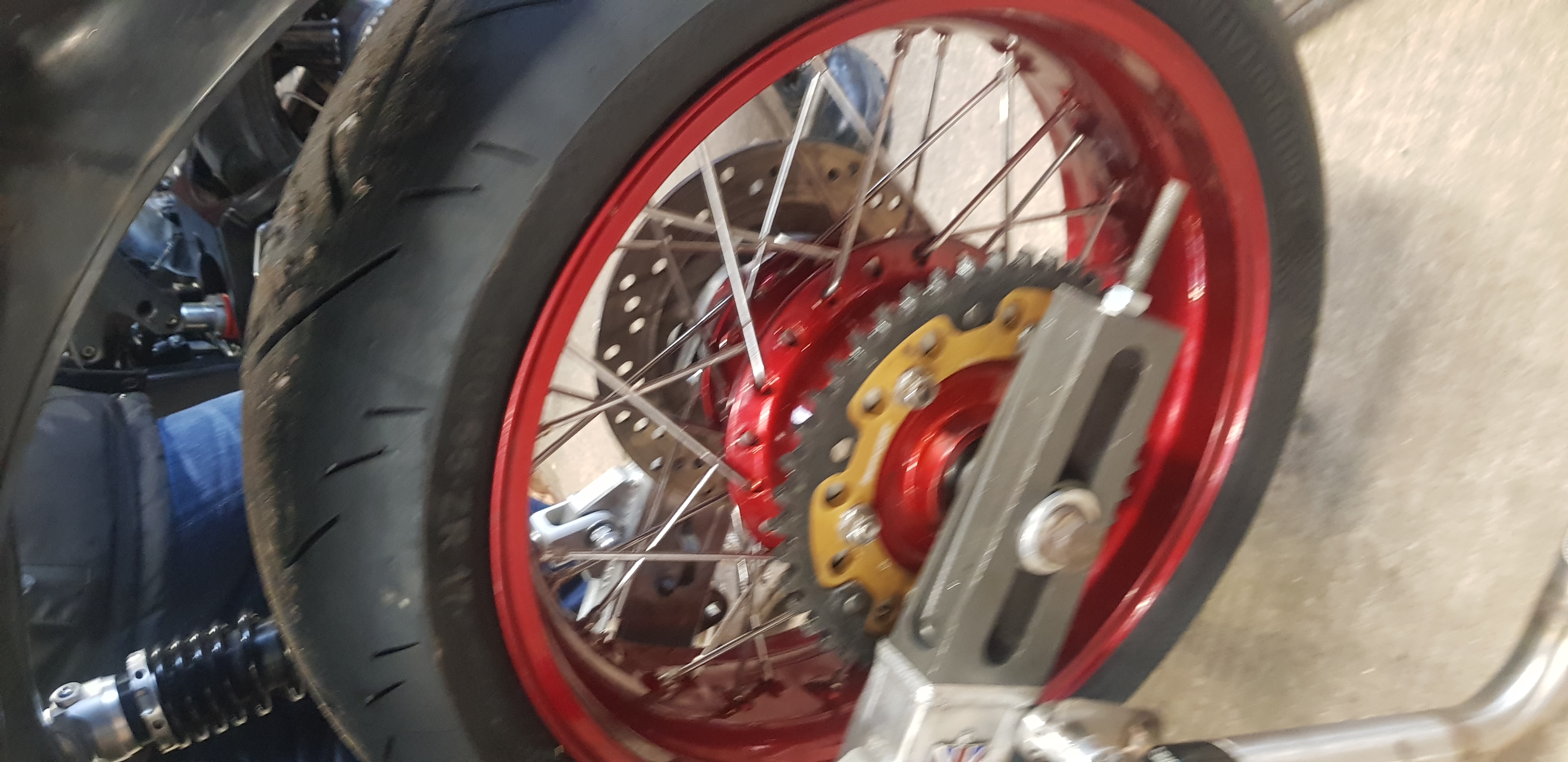 Why 17 inch rear wheel rim ? are the spoke angles on the rim correct for the hub. Has the bike got a drum brake or disc ?