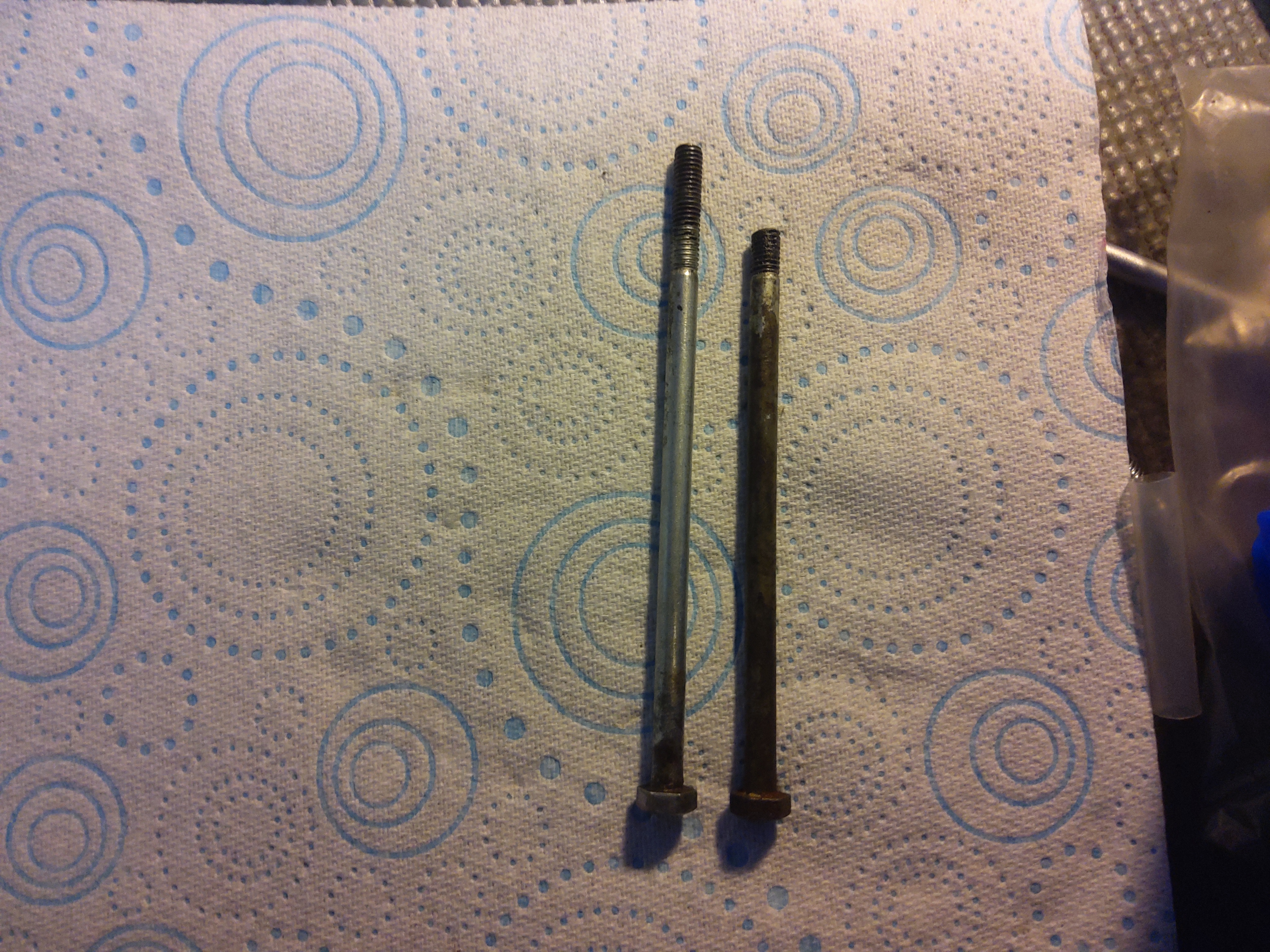 I think I've just twigged! Having just searched my box of old bolts I found this (pictured alongside an original intact 125mm bolt). So would the "blind" I found be the remains of the original 125mm bolt that snapped on the way out? If this is the most likely explanation, any suggestions as to the least damaging way of getting it out, remembering that it has been in there since the bike was built?