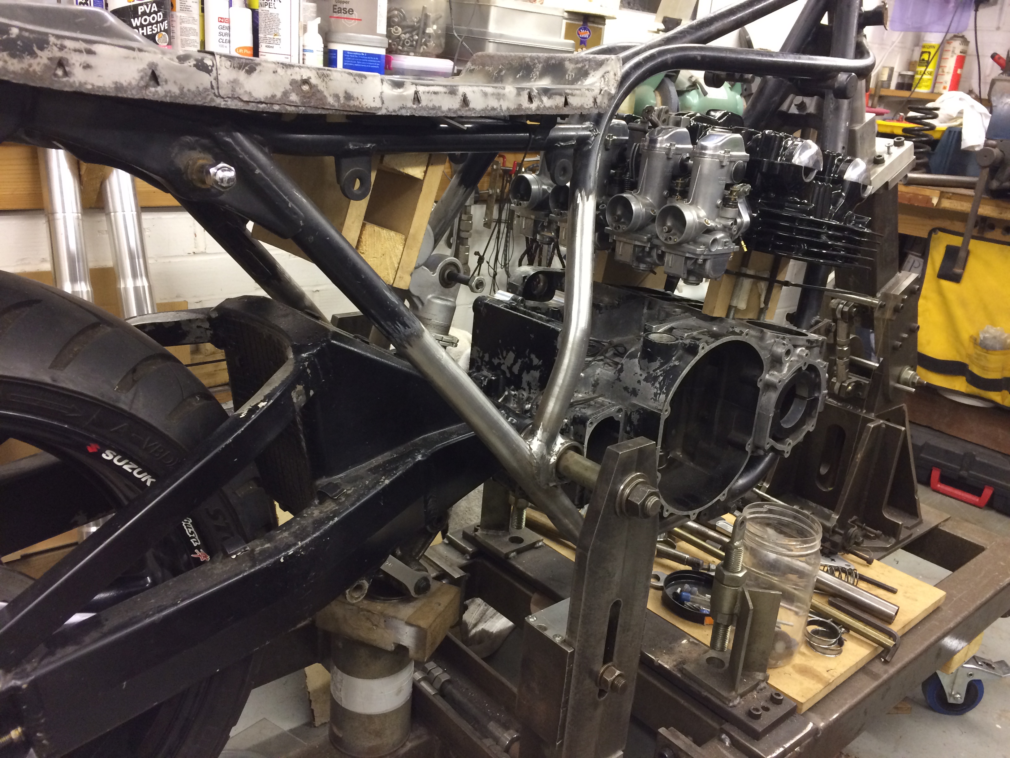 Happy with the sprocket I dropped the engine in the frame in the jig and prepared to make the new frame tubes.