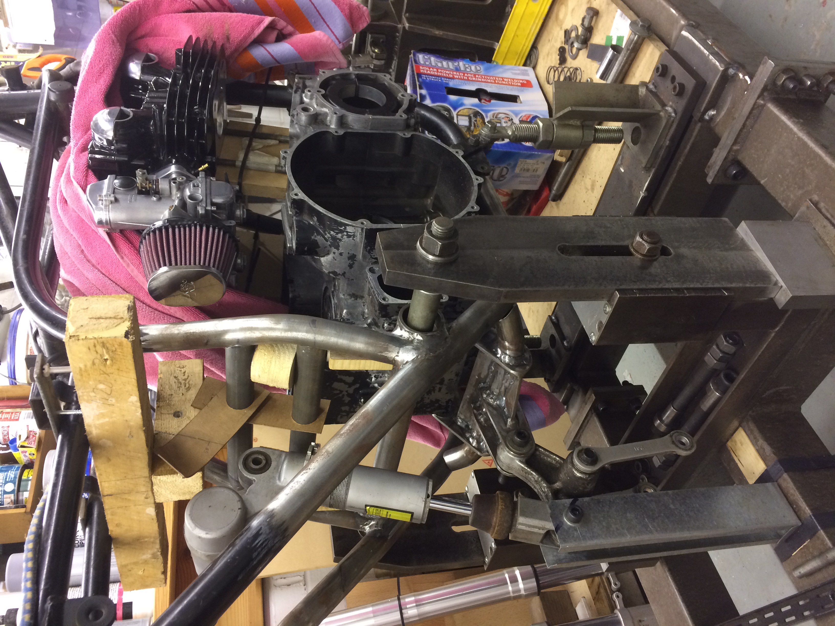 Mounting the foot pegs: Made a reversible jig locating off the swing arm point to hold the bosses in place to ensure they were equal both sides.