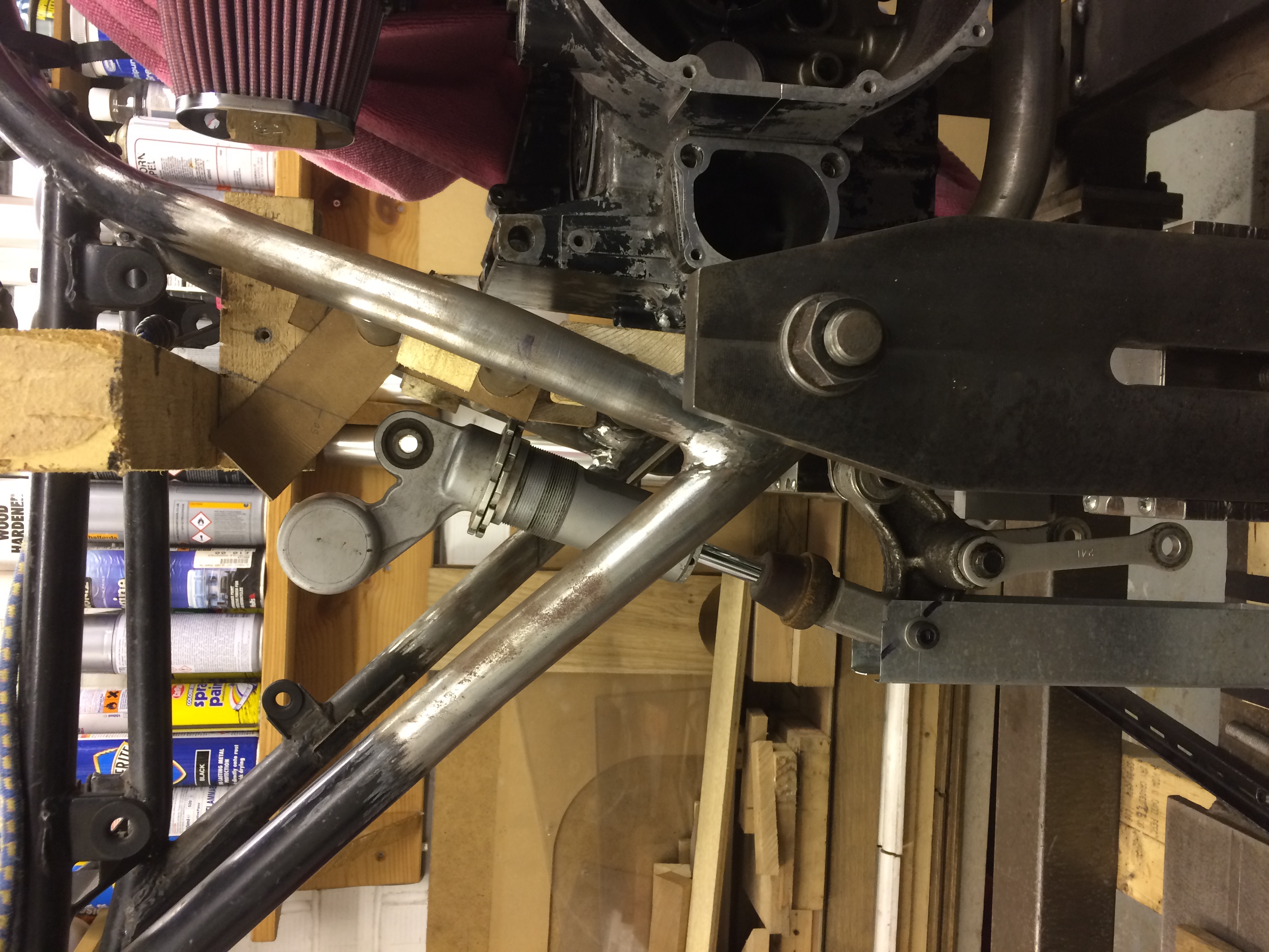 With the shocker all mounted I did a quick build off the frame jig. Looks like I used the SRAD yokes at this point. The picture isn’t quite square on, but it seems close to the Hayabusa suspension drawing. On a previous bike I had some problems with shocker and linkage lengths, so this time I made the top of the shock bolt onto adjustable plates to give more scope for movement if I needed it this time.