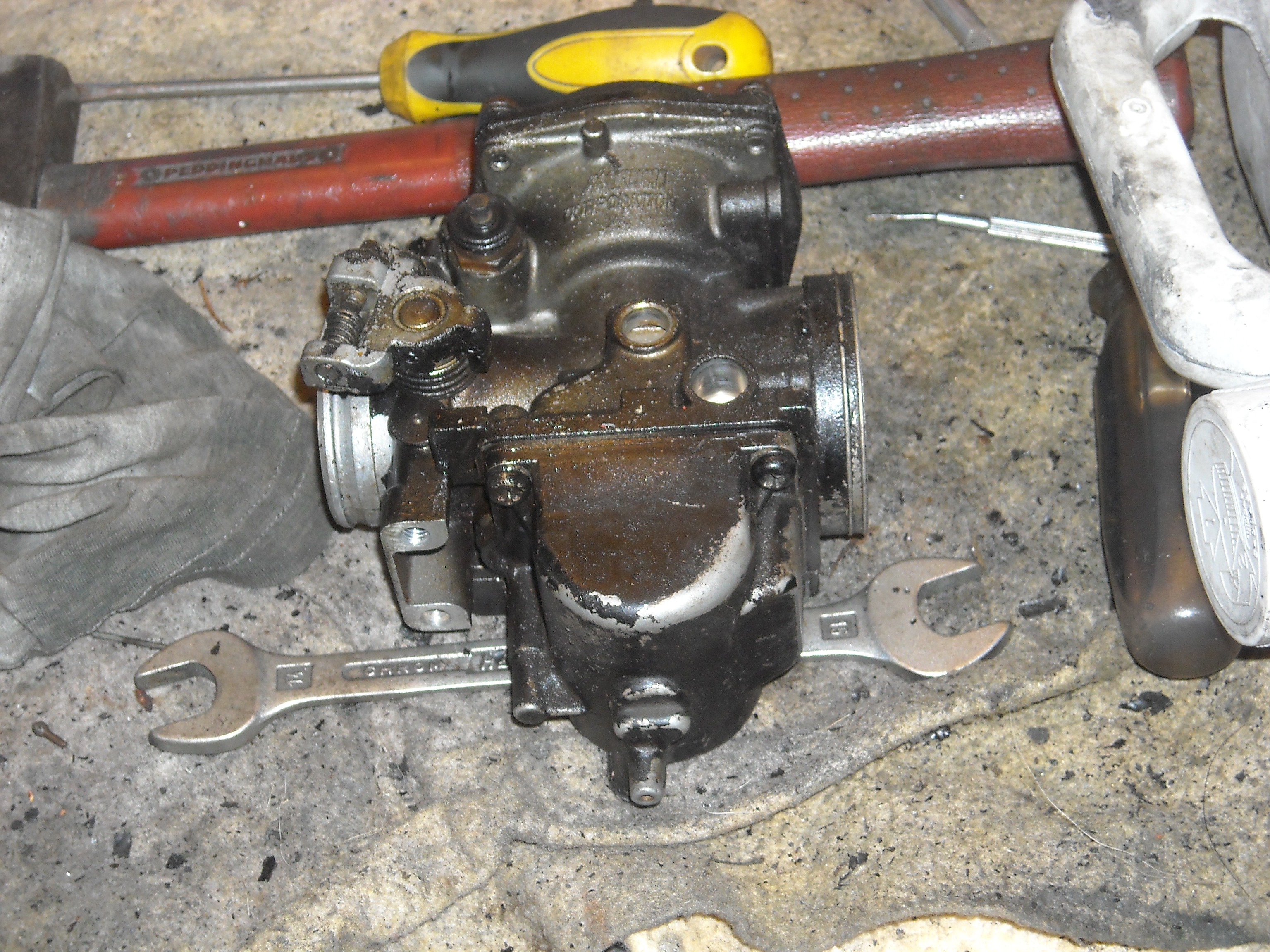 I decided to disassemble the carbs. They looked dirty and greasy on the outside. A cleaning with thinner would solve that and also partially dissolve the old black paint. I was going to repaint them anyway.