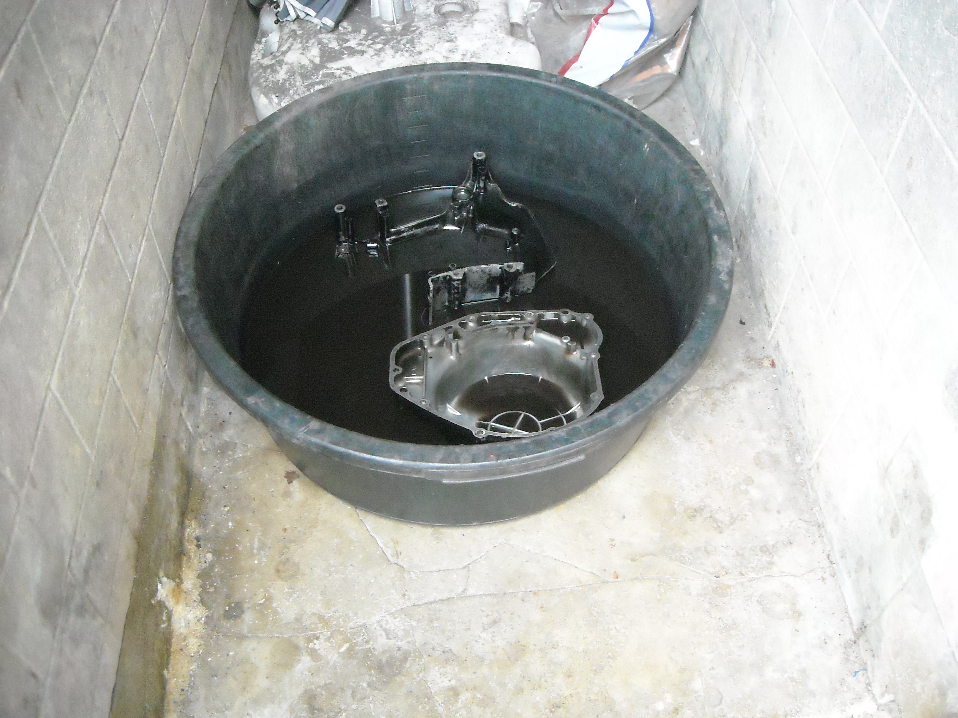 Because thes parts are too big to soak in the ant acid, I use a masons' tub with cellulose thinner. It takes about 10 litres of thinner to soak one side of a wheel. The plastic of the tub isn't affected by the thinner.
