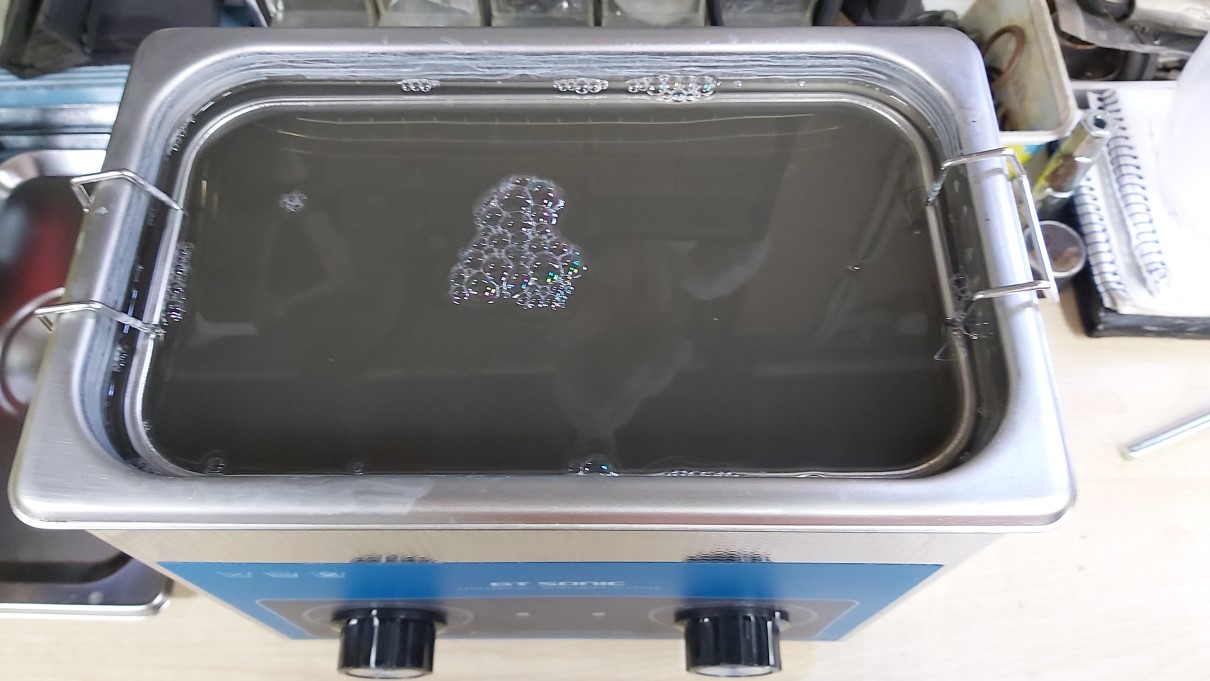 I invested in a small 3l ultrasonic cleaner and proceeded to split the entire carb rack to its individual components as I can only fit 1 carb in the cleaner at a time. The carbs weren't too dirty externally and Initially, I didn't think anything was happening, but after a 20 minute soak, I could see a change in the colour of the carb casings and various other components. Indeed - after cleaning all 4 carbs, the cleaning solution had turned a very muddy brown :shock: A quick rinse and a blow out with the airline and they're ready for the next stage - masking off the carbs and spraying them black as per the originals.
