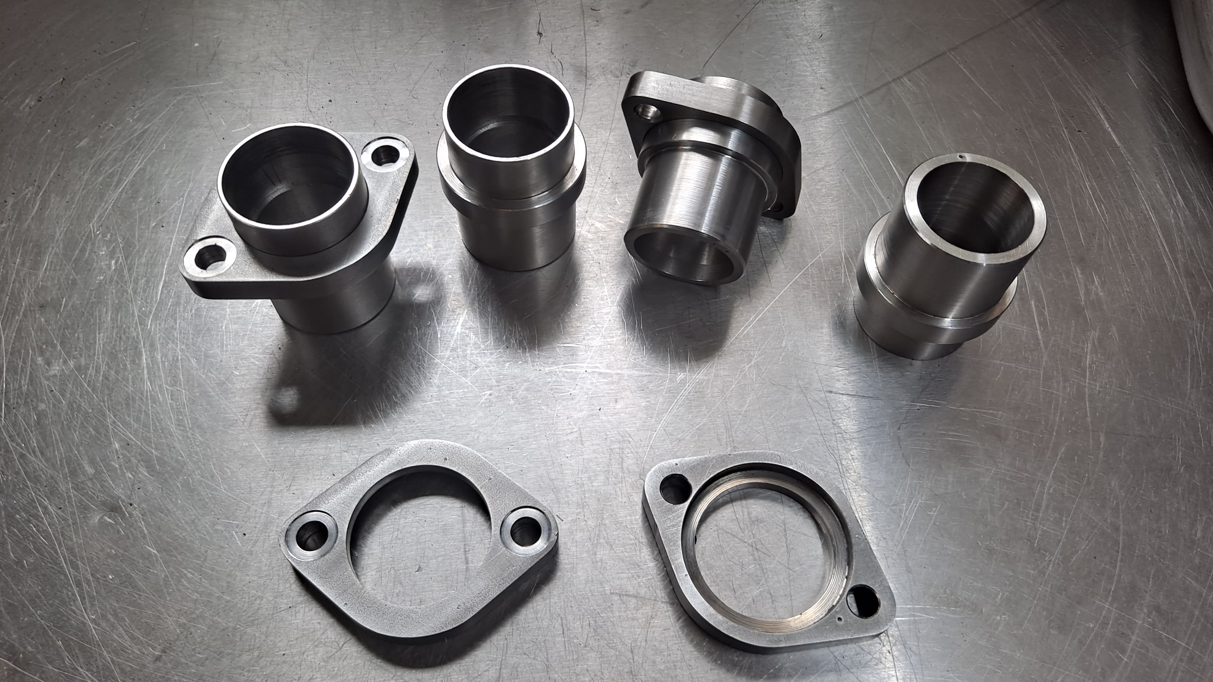The 2 inch solid bar was divided up the same and treated to a day in the lathe until i had the spigots and basic flanges..
