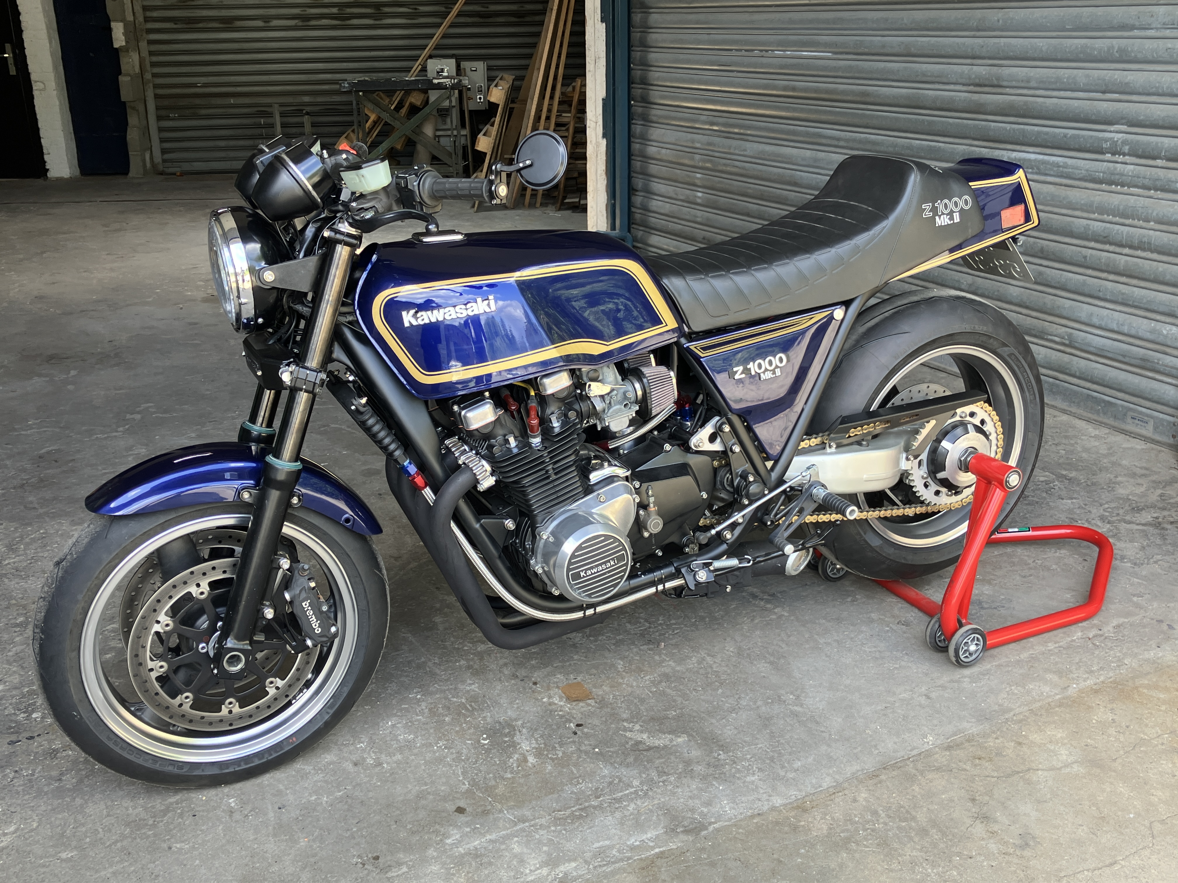 Together with a friend of mine we built this Z1000ST resto mod. It took us almost 5 years to get as far as this as we only worked on saturdays when we both had time. Drank some beers too. We decided to make it look like the MK2 but fitting MK2 parts to the ST made us realise that was too much work just for the looks. So we had the complete ST bodywork painted in MK2 colors but with more metallic in the blue and gold. Much to our surprise it turned out stunning. The stock frame has been modified for the ZX10R monoshock and home made link system with adjustable dog bones for a B-King. The VFR 750 single sider swingarm with Triumph hub and wheel has been fitted using bushings/spacers between frame and swingarm to get the rear wheel in line. Offset front sprocket to get the rear sprocket in line. The offset was big but we don't like the existing outrigger plates that are for sale, so we welded the support for the outrigger bearing inside a later Kawasaki engine cover. We used larger sprockets (19T up front) than normal to prevent the chain from touching the swingarm. Front forks are ZRX1100 with DLC coating , ZRX1100 front wheel with radial Brembo calipers on adapters and KTM Superduke discs on adapters. Both wheels painted like the MK2: black and with polished sides. We found some nice GTR1400 radial master cylinders left and right. Fitted 2004 Blade switch gear which turned out to be a pain in the neck as they normally talk with the ECU which does the rest. All modern electrics with MK2 replica wiring harness and modern fuse box. Headlamp glass is clear. Home made footrest brackets with Tarozzi shifter and brake lever with billet master cylinder. the Laser exhaust has a muffler on the right and a remote operated valve on the left. Electronic Speedhut gauges in stock surroundings (holes welded shut) and GPS antenna. Engine rebuilt , hydraulic clutch. Oil cooler with thermostat and also titanium and stainless bolts and nuts on frame and engine and handmade engine brackets ... Frame painted mat black and that looks greats. Biggest setback were the electrical connectors from Louis in Germany which took us almost 9 months (and some beer) to figure out that the electrical Gremlims were caused by them. Once swapped with good ones (which were bigger sadly) all fell into place. The bike now gets brake lines and is then ready for start-up.