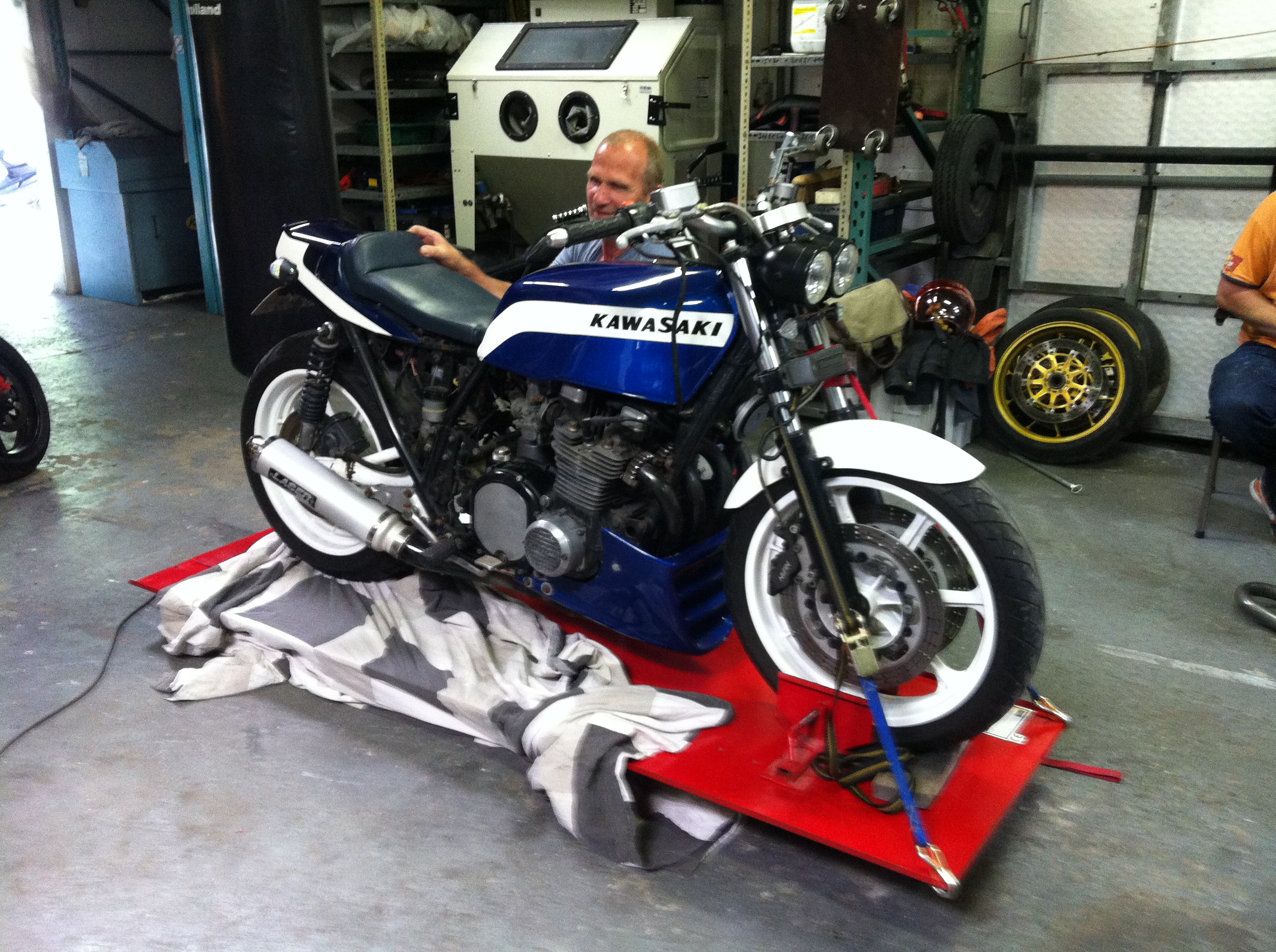 It all started with this one which we modified years earlier: shortened seat,widened wheels front and rear (18") , widened and braced stock swingarm, same ZRX forks, early Blade calipers on homemade brackets and ZZR1100 outer disc rings on homemade adapters. Front wheel was Z1300 (if I'm not mistaken) to get it to 18". VFR master cylinders and Blade switchgear.