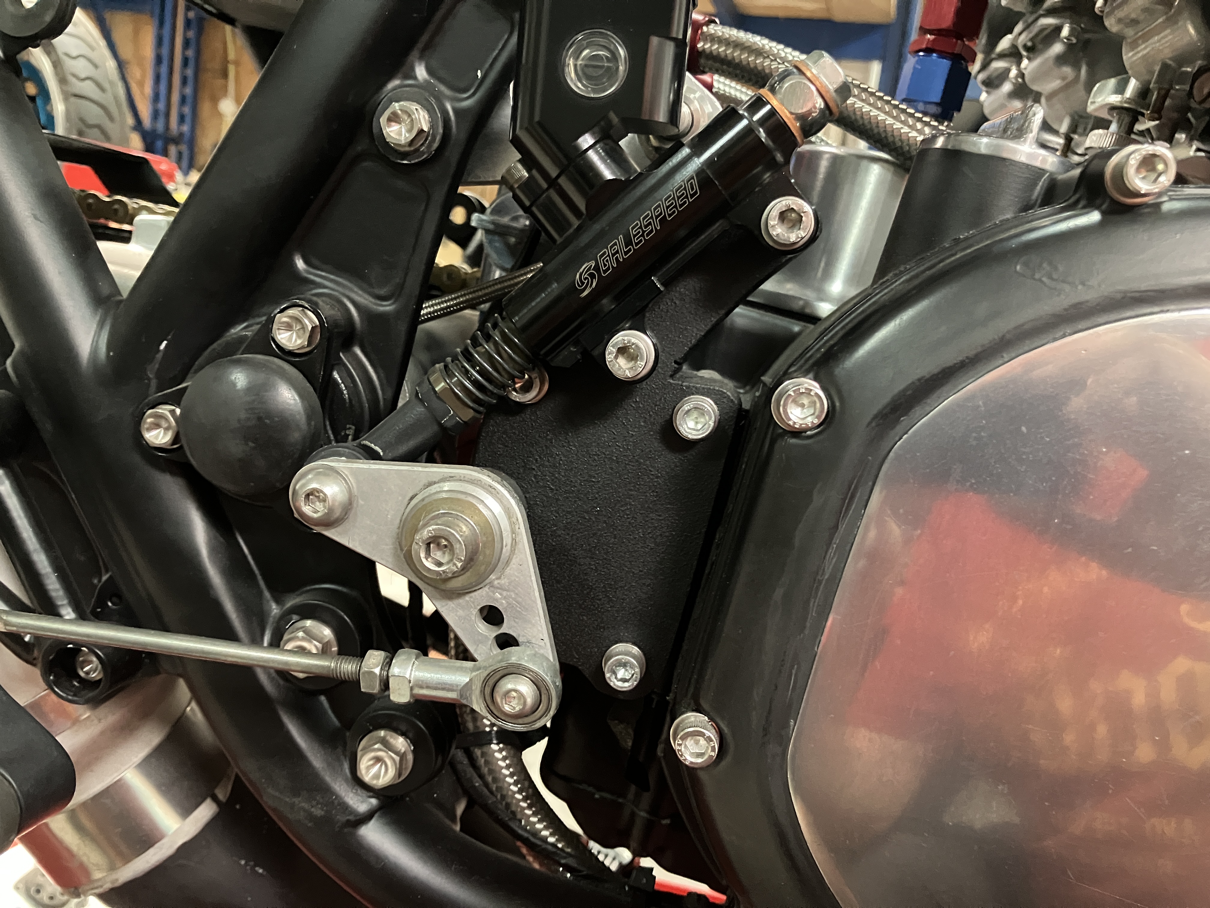 And that rear brake actuation.... glad you noticed it hahaha. It took us a while to get that figured out with the muffler, the frame tubes, the kickstarter shaft and the billet master. So we decided to ditch the kickstarter together with the shaft and make a new base plate where the kick start cover first was. On that cover we installed the master and the swivel point.